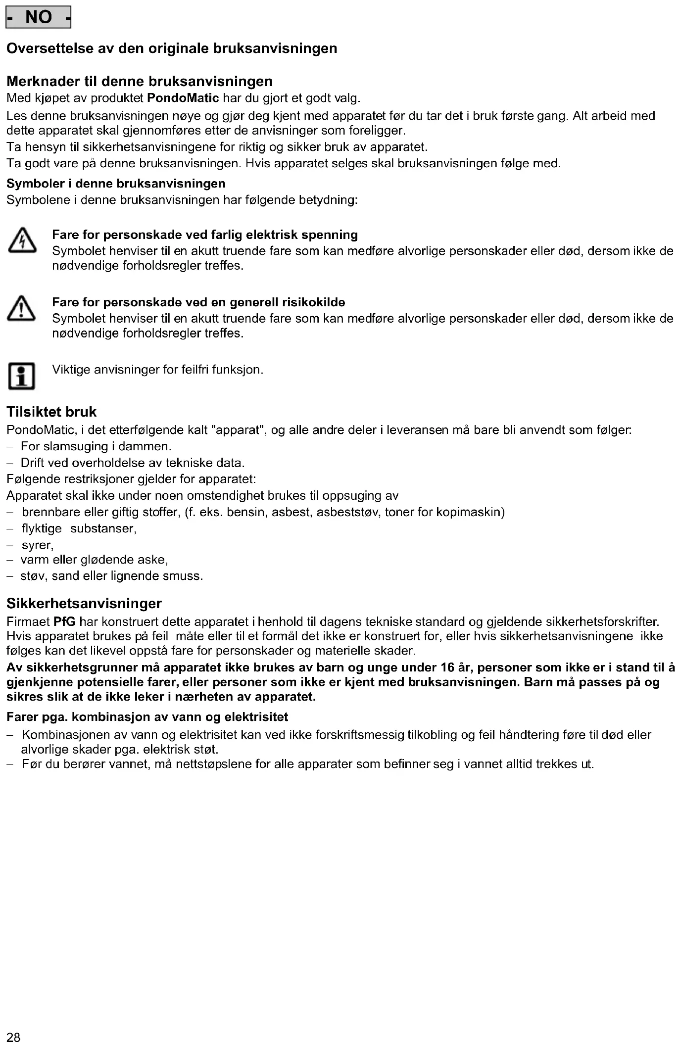 Firmaet PfG har konstruert dette apparatet i henhold til dagens tekniske standard og gjeldende sikkerhetsforskrifter. Hvis apparatet brukes på feil mæte eller til et formal det ikke er konstruert for,ller hvis sikkerhetsanvisningene ikke følges kan det likevel oppsta fare for personskader og materielle skader.