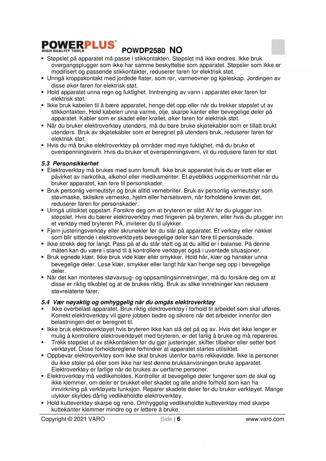 - Vi forbeholder oss retten til å avvise ethvert krav der kjøpet ikke kan verifiseres, eller når det er åpenbart at produktet ikke har blitt korrekt vedlikeholdt (rene ventilasjonsåpninger, kullbørster skiftet regelmessig, osv.).POWDP2580 NO Copyright © 2021 VARO Side | 19 www.varo.com