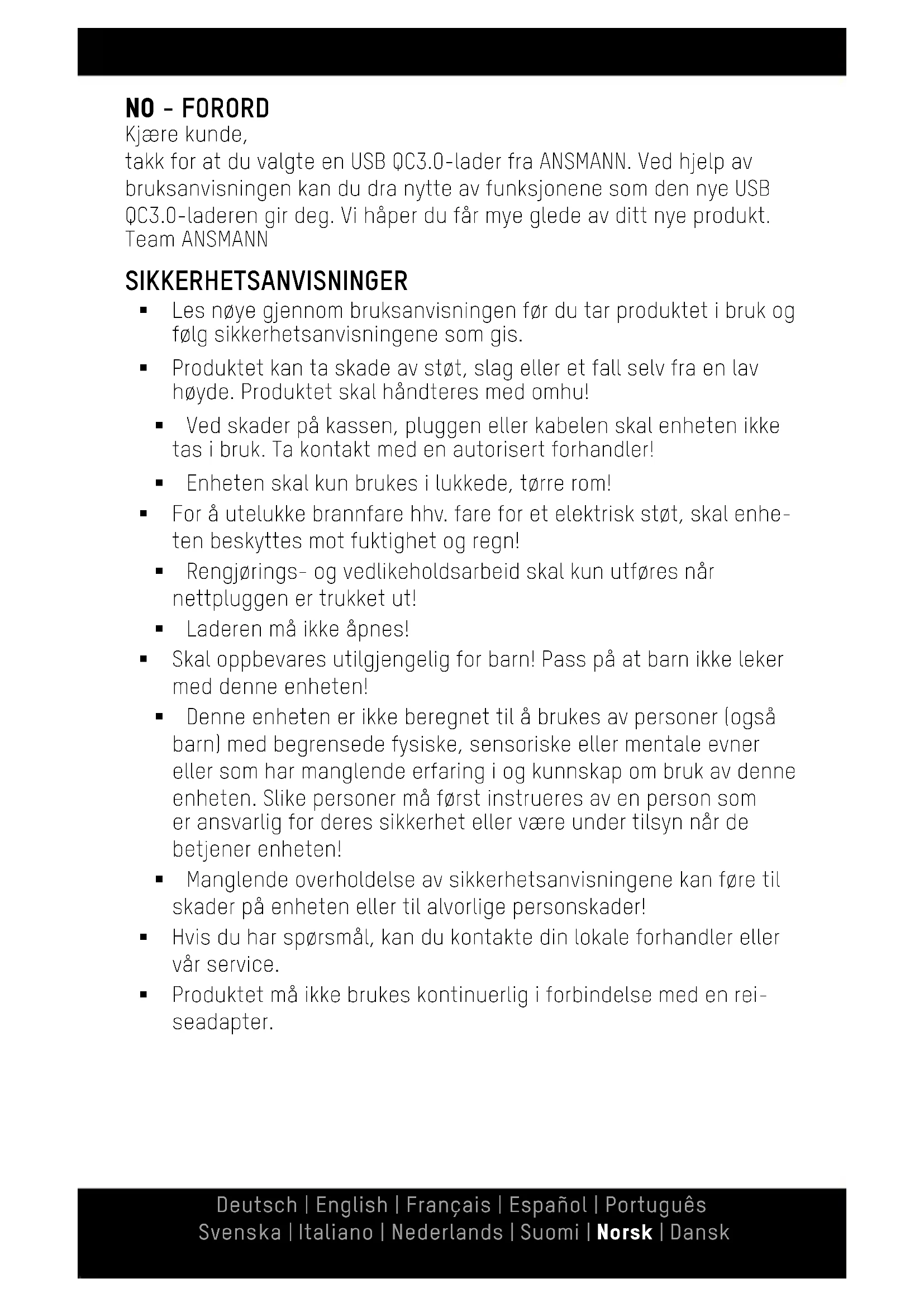 USB QC3.0-laderen er egnet for en nettspenning fra 100-240V og kan derfor brukes over hele verden. Vær oppmerksom på at det eventuelt kan være nødvendig med en spesiell adapter for hvert enkelt land. MERKNAD Automatisk gjenkjenning: ingen manuelle innstillinger eller en- dringer nødvendig, viktig er bare de riktige komponentene (kabel og sluttenhet må være QC3.0-kompatibel). Ved den svært store mengden av ulike QC3.0-sluttenheter og deres programvare- / fastvare-versjoner, kan det forekomme at funksjonen ikke blir gjenkjent eller at den ikke blir støttet på en optimal og fullstendig måte. Sluttenheter, med originale ladere som trenger mer enn 18W no- minell utgangseffekt, lades langsommere med denne laderen.ADVARSEL Det er viktig at alle sluttenheter som skal lades via USB QC3.0, er egnet for QC3.0-protokollen. Kontroller at din sluttenhet (smarttelefon, nettbrett, bærbar datamaskin, konsoll eller andre anvendelser) er egnet for en av utgangsspenningene 5V/9V/12V. PLEIE Trekk nettpluggen ut av stikkontakten før enheten rengjøres og hvis den ikke skal brukes over et lengre tidsrom. Laderen skal kun rengjøres med tørre og myke kluter. TEKNISKE DATA
