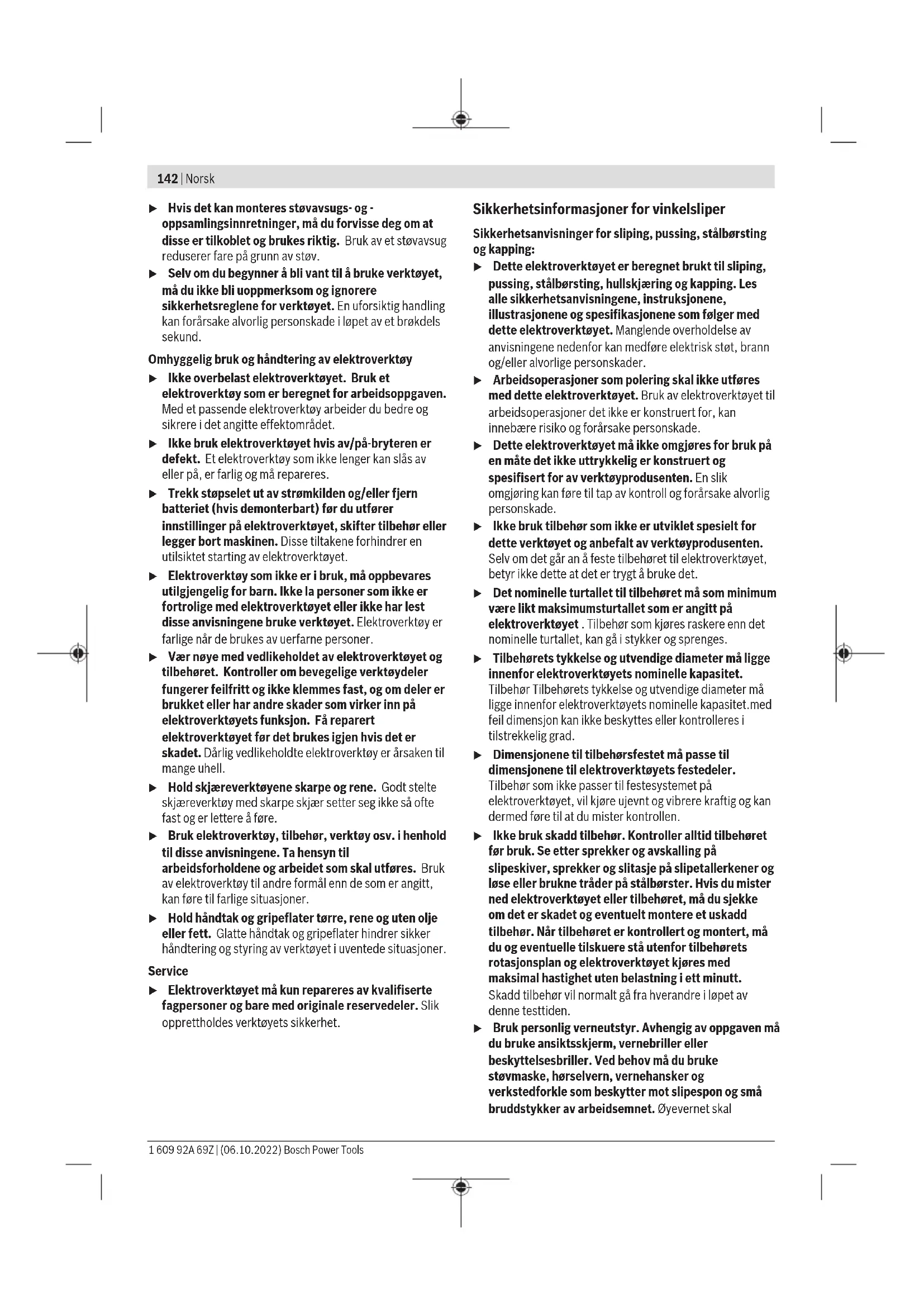 De angitte verdiene for turtallstrinnene er veiledende. Bosch Power Tools 1 609 92A 69Z | (06.10.2022)150 | Norsk Montering Montere verneinnretning u Før alle arbeider på elektroverktøyet utføres må støpselet trekkes ut av stikkontakten. Merknad: Etter brudd på slipeskiven under drift eller skader på festeinnretningene på vernedekselet/elektroverktøyet må elektroverktøyet omgående sendes inn til kundeservice. Adresser se avsnittet "Kundeservice og kundeveiledning". Vernedeksel for sliping Legg vernedekselet (11) på festet på elektroverktøyet. Kodetappene på vernedekselet skal stemme overens med festet. Mens du gjør dette, trykker du på utløserspaken (1) og holder den inne. Trykk vernedekselet (11) på spindelhalsen helt til kragen på vernedekselet sitter på flensen til elektroverktøyet, og drei vernedekselet til det høres at det festes. Tilpass plasseringen av vernedekselet (11) etter arbeidsoperasjonen. Dette gjør du ved å trykke utløserspaken (1) opp og dreie vernedekselet (11) til ønsket stilling. u Still alltid inn vernedekselet (11) slik at begge tappene på utløserspaken (1) griper inn i de tilsvarende utsparingene til vernedekselet (11). u Still inn vernedekselet (11) slik at gnistregn i retning brukeren unngås. u Vernedekselet (11) skal bare kunne dreies ved aktivering av utløserspaken (1) ! Ellers må elektroverktøyet ikke brukes videre og må leveres til kundeservice. Merknad: Kodetappene på vernedekselet (11) sikrer at bare et vernedeksel som passer til elektroverktøyet, kan monteres. Støvavsugsdeksel for sliping Ved sliping av maling, lakk og plast ved bruk av hardmetall- koppskiver(15) kan du bruke støvavsugsdekselet(10), slik at lite støv slippes ut i omgivelsene. Støvavsugsdekselet(10) er ikke egnet for bearbeiding av metall. En egnet støvsuger fra Bosch kan kobles til støvavsugsdekselet(10). Du setter da støvsugerslangen med støvsugeradapteren i den beregnede festestussen på støvavsugsdekselet. Vernedeksel for kapping u Ved kapping må du alltid bruke vernedekselet for kapping(12) eller vernedekselet for sliping (11) sammen med beskyttelsen for kapping (13). u Sørg for tilstrekkelig støvavsug ved kapping i stein. Vernedekselet for kapping(12) monteres som vernedekselet for sliping(11). Deksel for kapping av metall Montere beskyttelsen for kapping(13) av metall på vernedekselet for sliping(11) (se bildeA): Sving festebøylen tilbake (➊). Sett beskyttelsen(13) på vernedekselet for sliping(11) (➋). Trykk festebøylen fast på vernedekselet(11) (➌). For å demontere (se bildeB) trykker du på knappen på festebøylen (➊) og svinger den tilbake (➋). Trekk beskyttelsen(13) fra vernedekselet (11) (➌). Deksel for kapping av plast Sett beskyttelsen for kapping(13) av plast på vernedekselet for sliping(11) (se bildeC). Beskyttelsen(13) festes hørbart på vernedekselet(11). For å demontere (se bildeD) løsner du beskyttelsen(13) på vernedekselet(11) (➊) til venstre eller høyre og trekker beskyttelsen av (➋). Støvavsugsdeksel for kapping med styreskinner Avsugshetten for kapping med styreskinne(34) monteres som vernedekselet for sliping. Ekstrahåndtaket(8)/(9) festes av bøylen på vernedekselet, helt til girkassehuset, slik at elektroverktøyet blir fast forbundet med vernedekselet. En egnet støvsuger fra Bosch kan kobles til støvavsugsdekselet med styreskinne(34). Du setter da støvsugerslangen med støvsugeradapteren i den beregnede festestussen på støvavsugsdekselet. Merknad: Friksjonen som oppstår av støvet i sugeslangen og tilbehøret under arbeidet forårsaker en elektrostatisk oppladning som brukeren kan oppleve som statisk utladning (avhengig av omgivelsesfaktorer og brukerens fysiologiske tilstand). Bosch anbefaler generelt å bruke en antistatisk sugeslange (tilbehør) til fjerning av fint støv og tørre materialer. Håndbeskyttelse u Monter alltid håndbeskyttelsen når du skal arbeide med gummislipeskiven (27) eller koppbørsten / skivebørsten / den koniske børsten / diamantborekronen (26). Fest håndbeskyttelsen(26) med ekstrahåndtaket(8)/(9). Standard ekstrahåndtak / vibrasjonsdempende ekstrahåndtak Skru fast ekstrahåndtaket(8)/(9) til høyre eller venstre på girhodet, avhengig av hvordan du arbeider. u Bruk ikke elektroverktøyet uten ekstrahåndtaket (8)/ (9). u Du må ikke fortsette å bruke elektroverktøyet hvis ekstrahåndtaket (8)/(9) er skadet. Du må ikke foreta noen endringer på ekstrahåndtaket(8)/(9). Det vibrasjonsdempende ekstrahåndtaket(9) gir mulighet til sikrere og mer komfortabelt arbeid med lite vibrasjoner. 1 609 92A 69Z | (06.10.2022) Bosch Power ToolsNorsk | 151 Montere slipeverktøy u Før alle arbeider på elektroverktøyet utføres må støpselet trekkes ut av stikkontakten. u Ikke berør slipe- og kappeskiver før de er avkjølt. Skivene blir svært varme under arbeidet. Rengjør slipespindelen (25)og alle delene som skal monteres. Trykk på spindellåseknappen (2) for å låse slipespindelen når du skal spenne fast og løsne slipeverktøyet. u Trykk på spindellåseknappen bare når slipespindelen er stanset. Elektroverktøyet kan ta skade hvis det velter. Slipe-/kappeskive Vær oppmerksom på målene til slipeverktøyet. Hulldiameteren må passe til festeflensen. Bruk ikke adaptere eller reduksjonsstykker. Ved bruk av diamantkappeskiver må du passe på at dreieretningspilen på diamantkappeskiven og elektroverktøyets dreieretning (se dreieretningspil på huset) stemmer overens. Monteringsrekkefølgen vises på siden med illustrasjoner. Merknad: Ved montering av bundne slipe- eller kappeskiver ved hjelp av festeflensen som følger med(14) og spennmutteren(21) eller hurtigspennmutteren(22) er det ikke nødvendig å bruke mellomlag. For å feste slipe-/kappeskiven setter du festeflensen med o- ring(14) på slipespindelen(25) og skrur på spennmutteren (21). Pass på plasseringen av spennmutteren(21) avhengig av benyttet slipe-/kappeskive (se illustrasjonen