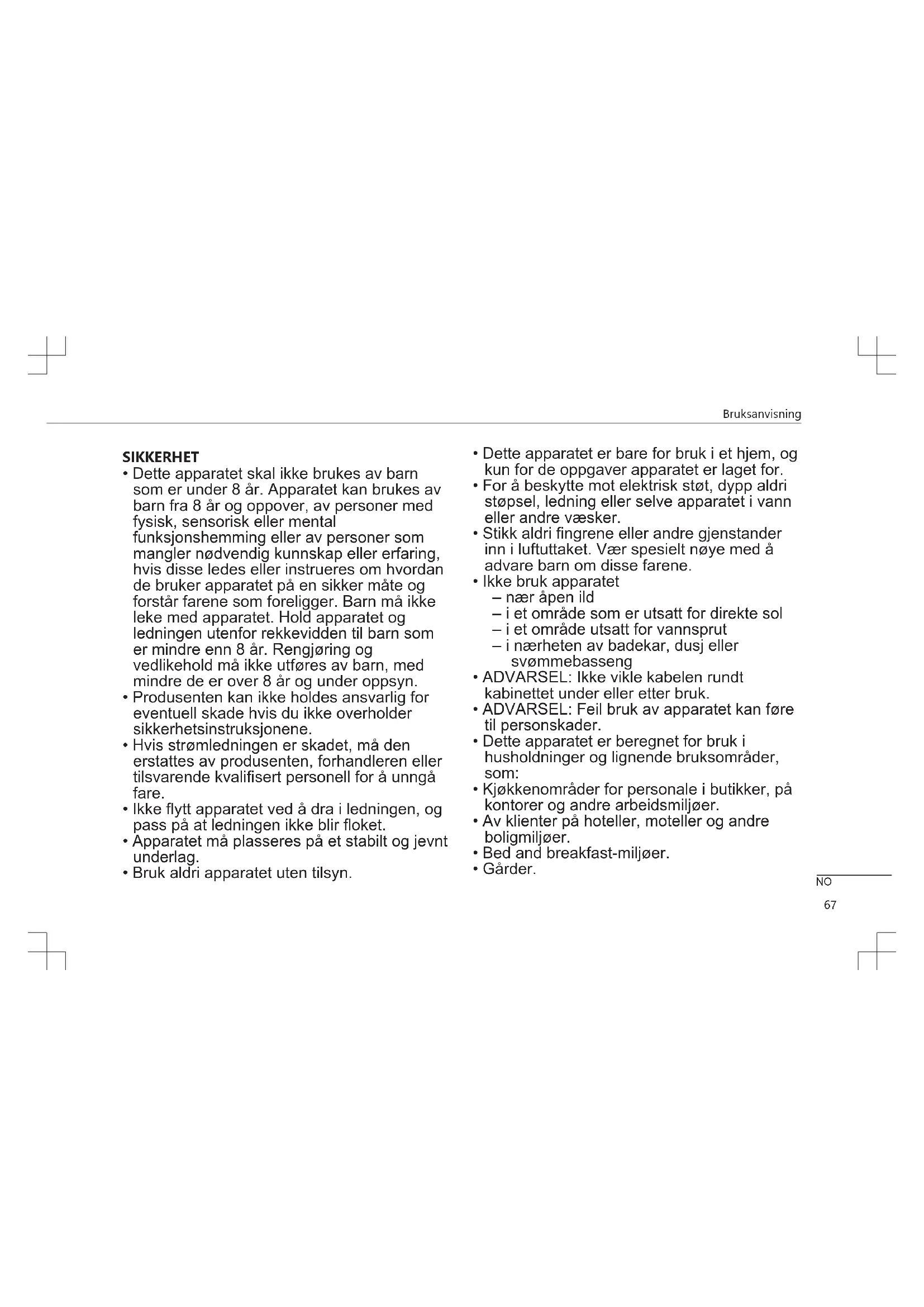 - Dette apparatet skal ikke brukes av barn som er under 8 år. Apparatet kan brukes av barn fra 8 år og oppover, av personer med fysisk, sensorisk eller mental funksjonshemming eller av personer som mangler nødvendig kunnskap eller erfaring, hvis disse ledes eller instrueres om hvordan de bruker apparatet på en sikker måte og forstår farene som foreligger. Barn må ikke leke med apparatet. Hold apparatet og ledningen utenfor rekkevidden til barn som er mindre enn 8 år. Rengjøring og vedlikehold må ikke utføres av barn, med mindre de er over 8 år og under oppsyn.