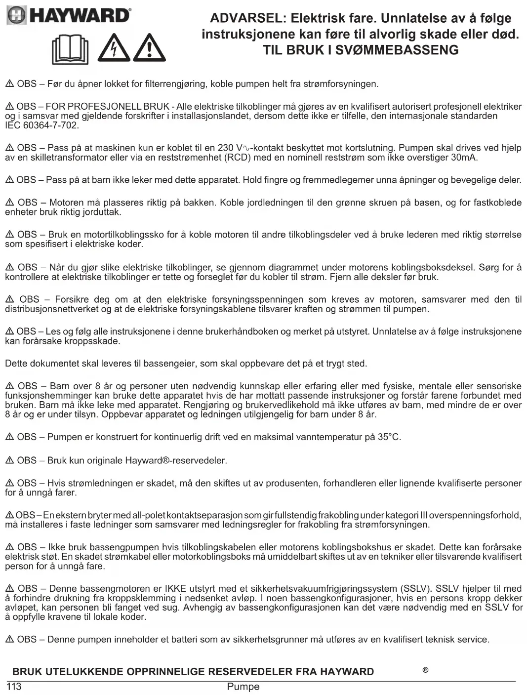 - OBS – Les og følg alle instruksjonene i denne brukerhåndboken og merket på utstyret. Unnlatelse av å følge instruksjonene kan forårsake kroppsskade. Dette dokumentet skal leveres til bassengeier, som skal oppbevare det på et trygt sted.