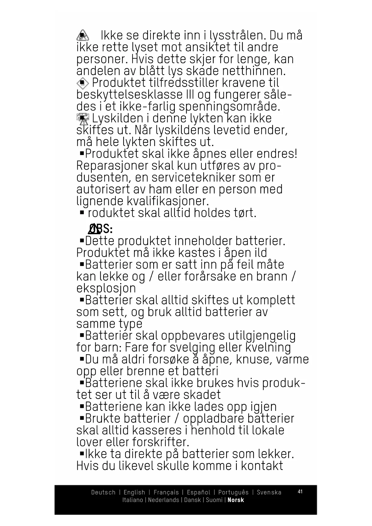 OBS: §Dette produktet inneholder batterier. Produktet må ikke kastes i åpen ild §Batterier som er satt inn på feil måte kan lekke og / eller forårsake en brann / eksplosjon §Batterier skal alltid skiftes ut komplett som sett, og bruk alltid batterier av samme type §Batterier skal oppbevares utilgjengelig for barn: Fare for svelging eller kvelning §Du må aldri forsøke å åpne, knuse, varme opp eller brenne et batteri §Batteriene skal ikke brukes hvis produk- tet ser ut til å være skadet §Batteriene kan ikke lades opp igjen §Brukte batterier / oppladbare batterier skal alltid kasseres i henhold til lokale lover eller forskrifter. §Ikke ta direkte på batterier som lekker. Hvis du likevel skulle komme i kontakt Deutsch | English | Français | Español | Português | Svenska Italiano | Nederlands | Dansk | Suomi | Norsk42 med batterivæske, skal du umiddelbart vaske det berørte stedet grundig med vann §Dersom batterivæsken har forårsaket en hudirritasjon eller om du får den i øyne- ne, må du umiddelbart kontakte lege §Ikke kortslutt batteriene! §Bruk av oppladbare batterier og batterier som er egnet for sterkstrøm er ikke til- latt på grunn av andre elektriske verdier. §Ta brukte eller tomme batterier umiddel- bart ut av lykten §Hvis lykten ikke kan brukes lenger, må batteriene tas ut av lykten før den leve- res til avfallsbehandling