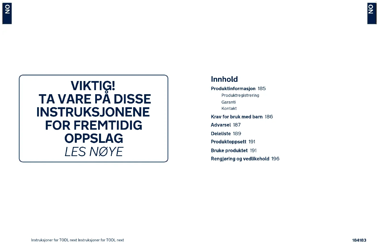 Innhold Produktinformasjon 185 Produktregistrering Garanti Kontakt Krav for bruk med barn 186 Advarsel 187 Deleliste 189 Produktoppsett 191 Bruke produktet 191 Rengjøring og vedlikehold 196 VIKTIG!