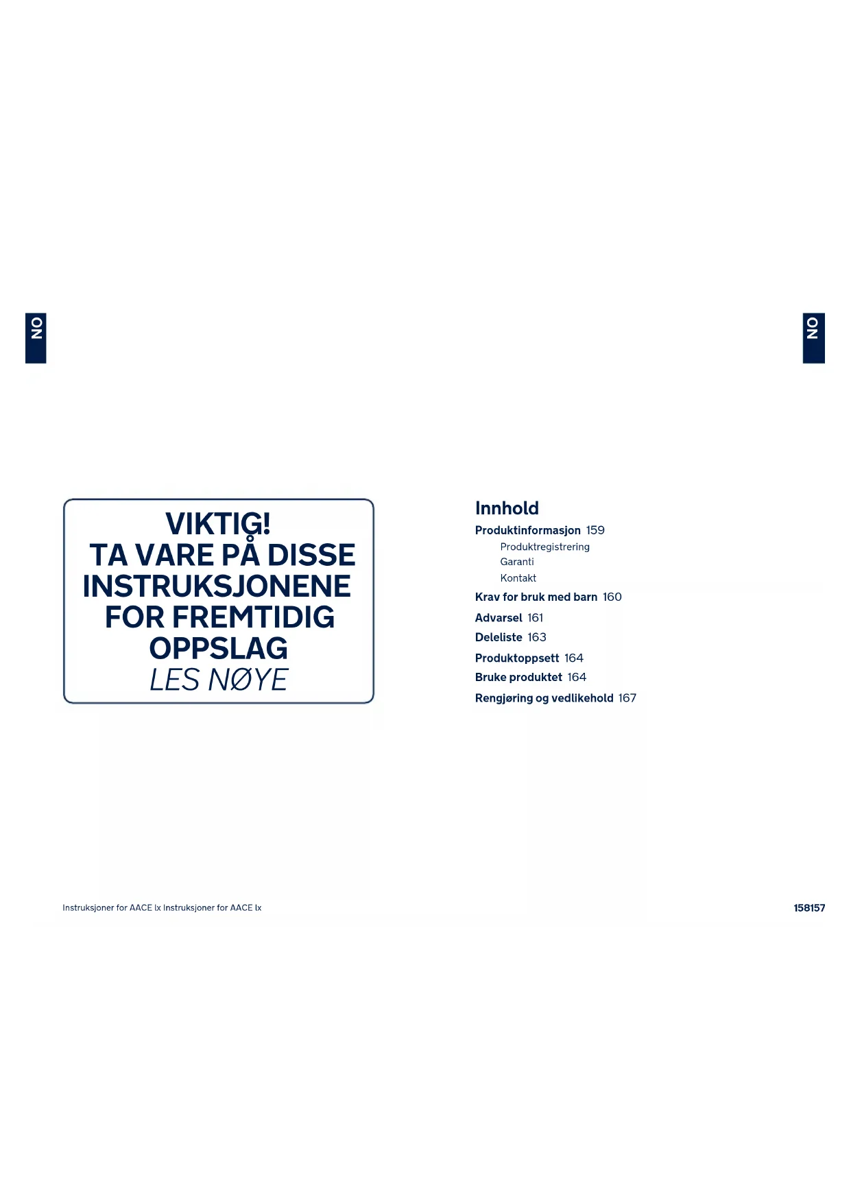 Инструкция к AACE lx Инструкция к AACE lxInnhold Produktinformasjon 159 Produktregistrering Garanti Kontakt Krav for bruk med barn 160 Advarsel 161 Deleliste 163 Produktoppsett 164 Bruke produktet 164 Rengjøring og vedlikehold 167 VIKTIG!