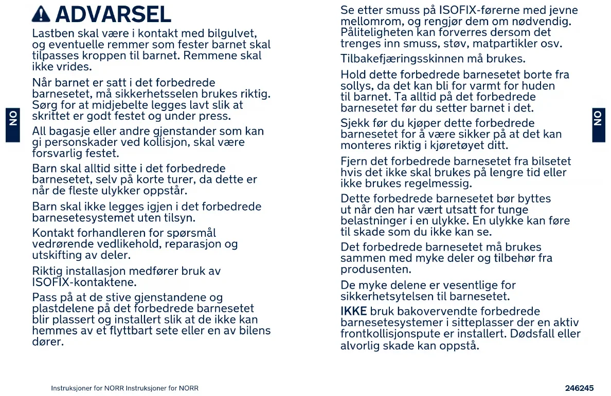 Instruksjoner for NORR Instruksjoner for NORRADVARSEL Lastben skal være i kontakt med bilgulvet, og eventuelle remmer som fester barnet skal tilpasses kroppen til barnet. Remmene skal ikke vrides. Når barnet er satt i det forbedrede barnesetet, må sikkerhetsselen brukes riktig. Sørg for at midjebelte legges lavt slik at skrittet er godt festet og under press. All bagasje eller andre gjenstander som kan gi personskader ved kollisjon, skal være forsvarlig festet. Barn skal alltid sitte i det forbedrede barnesetet, selv på korte turer, da dette er når de fleste ulykker oppstår. Barn skal ikke legges igjen i det forbedrede barnesetesystemet uten tilsyn. Kontakt forhandleren for spørsmål vedrørende vedlikehold, reparasjon og utskifting av deler. Riktig installasjon medfører bruk av ISOFIX-kontaktene. Pass på at de stive gjenstandene og plastdelene på det forbedrede barnesetet blir plassert og installert slik at de ikke kan hemmes av et flyttbart sete eller en av bilens dører. Se etter smuss på ISOFIX-førerne med jevne mellomrom, og rengjør dem om nødvendig. Påliteligheten kan forverres dersom det trenges inn smuss, støv, matpartikler osv. Tilbakefjæringsskinnen må brukes. Hold dette forbedrede barnesetet borte fra sollys, da det kan bli for varmt for huden til barnet. Ta alltid på det forbedrede barnesetet før du setter barnet i det. Sjekk før du kjøper dette forbedrede barnesetet for å være sikker på at det kan monteres riktig i kjøretøyet ditt. Fjern det forbedrede barnesetet fra bilsetet hvis det ikke skal brukes på lengre tid eller ikke brukes regelmessig. Dette forbedrede barnesetet bør byttes ut når den har vært utsatt for tunge belastninger i en ulykke. En ulykke kan føre til skade som du ikke kan se. Det forbedrede barnesetet må brukes sammen med myke deler og tilbehør fra produsenten. De myke delene er vesentlige for sikkerhetsytelsen til barnesetet. IKKE bruk bakovervendte forbedrede barnesetesystemer i sitteplasser der en aktiv frontkollisjonspute er installert. Dødsfall eller alvorlig skade kan oppstå.