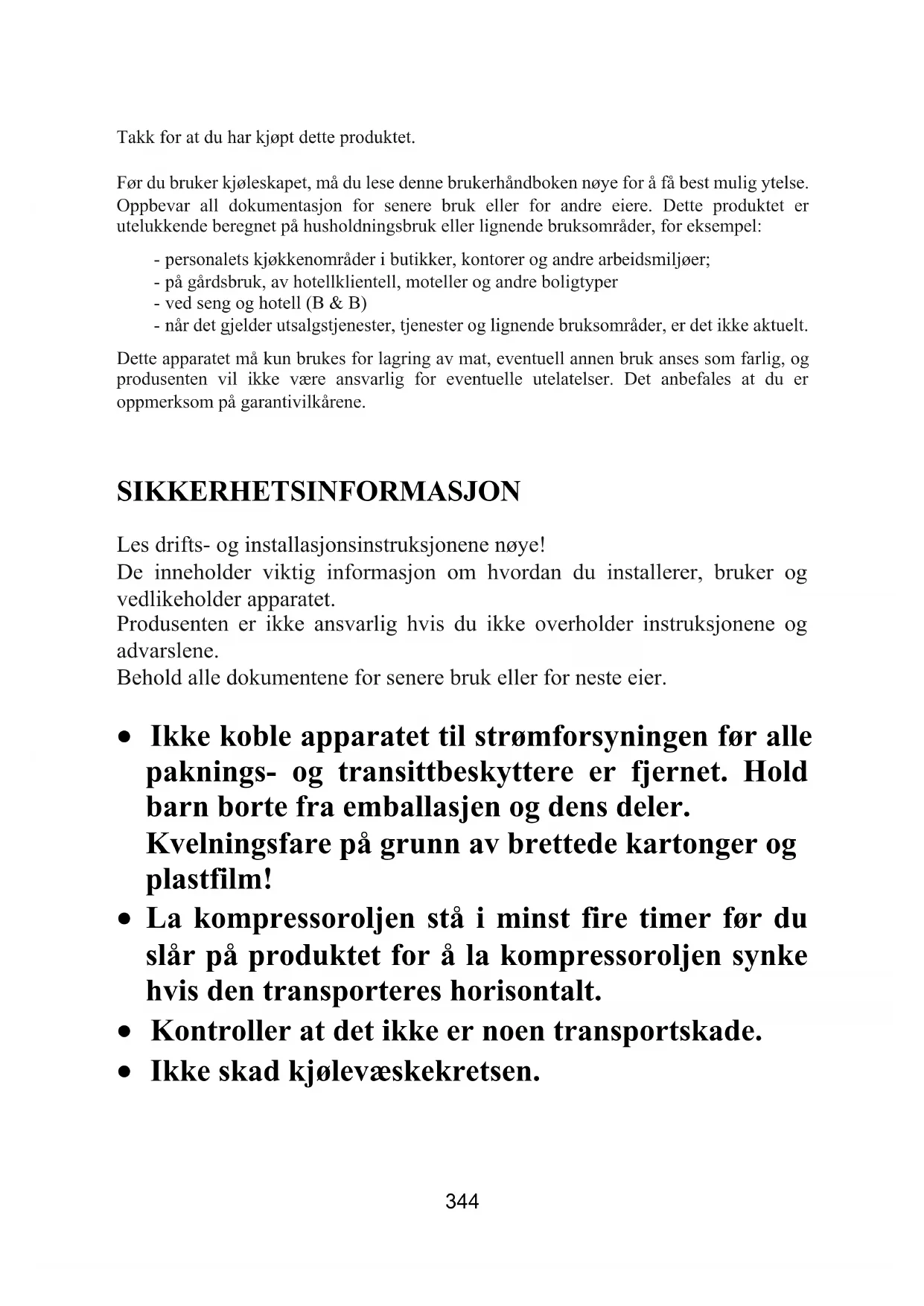 - Feilsøking 343344 Takk for at du har kjøpt dette produktet. Før du bruker kjøleskapet, må du lese denne brukerhåndboken nøye for å få best mulig ytelse. Oppbevar all dokumentasjon for senere bruk eller for andre eiere. Dette produktet er utelukkende beregnet på husholdningsbruk eller lignende bruksområder, for eksempel: - personalets kjøkkenområder i butikker, kontorer og andre arbeidsmiljøer; - på gårdsbruk, av hotellklientell, moteller og andre boligtyper - ved seng og hotell (B & B) - når det gjelder utsalgstjenester, tjenester og lignende bruksområder, er det ikke aktuelt. Dette apparatet må kun brukes for lagring av mat, eventuell annen bruk anses som farlig, og produsenten vil ikke være ansvarlig for eventuelle utelatelser. Det anbefales at du er oppmerksom på garantivilkårene. SIKKERHETSINFORMASJON Les drifts- og installasjonsinstruksjonene nøye! De inneholder viktig informasjon om hvordan du installerer, bruker og vedlikeholder apparatet. Produsenten er ikke ansvarlig hvis du ikke overholder instruksjonene og advarslene. Behold alle dokumentene for senere bruk eller for neste eier. p. 366