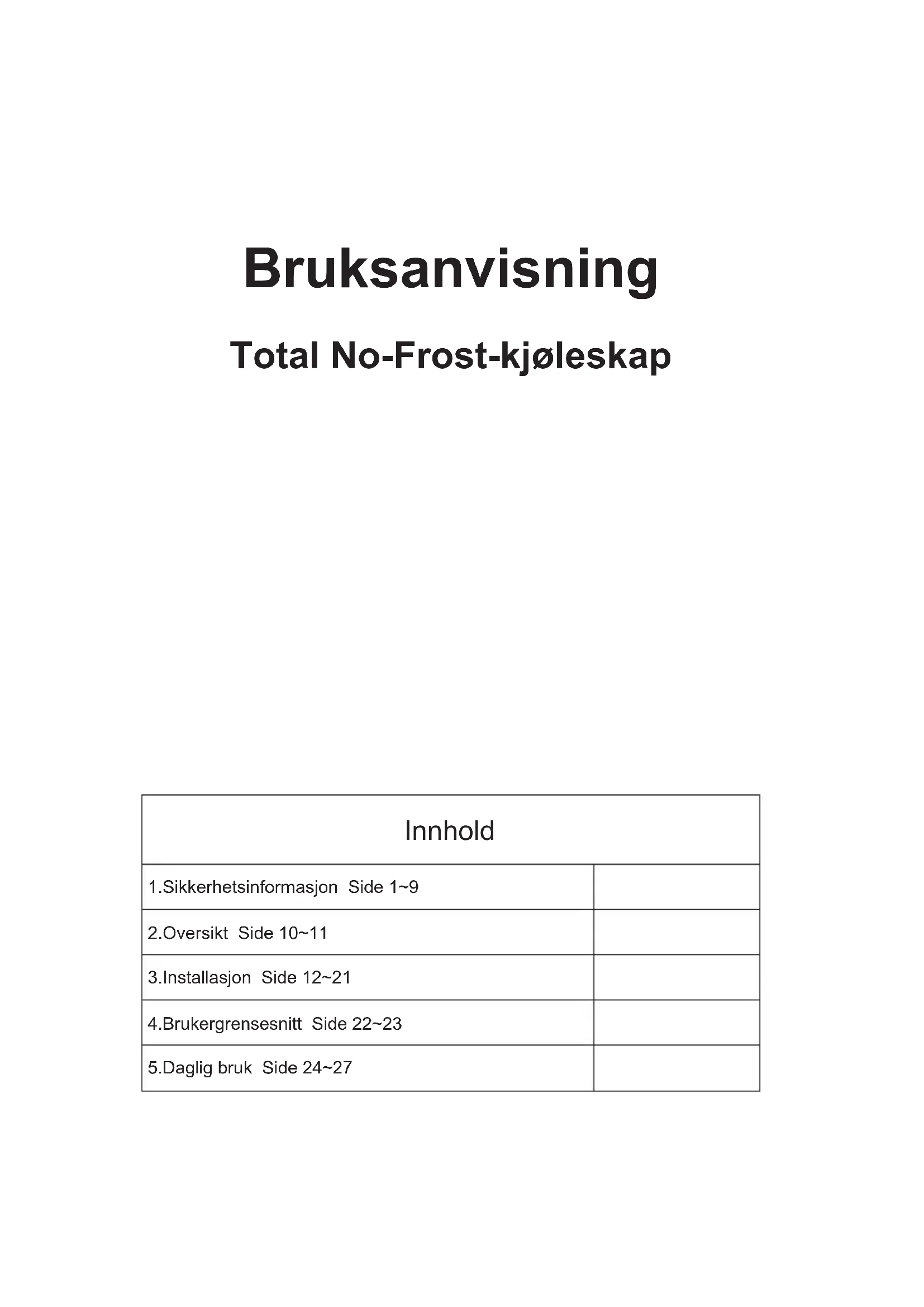 e necessario, regolare il termostato di conseguenza come descritto sopra. La temperatura all'interno del frigorifero è influenzata da diversi fattori, come la temperatura ambiente, la quantità di cibo conservato e la frequenza con cui viene aperta la porta. Tenere in considerazione questi fattori quando si imposta la temperatura. Per garantire che il cibo nel frigorifero sia ben conservato, specialmente nella parte più fredda, assicurarsi che l'indicatore della temperatura mostri "OK". Se “OK” non viene visualizzato, significa che la temperatura in quella parte è troppo elevata. Impostare il termostato su una posizione più alta. Attendere almeno 12 ore prima di regolare nuovamente il termostato. Dopo aver inserito alimenti freschi all'interno dell'elettrodomestico o dopo ripetute (o prolungate) aperture della porta, è normale che l'indicazione “OK” non venga visualizzata sull'indicatore. 28Bruksanvisning Total No-Frost-kjøleskap Innhold 1.Sikkerhetsinformasjon Side 1~9 2.Oversikt Side 10~11 3.Installasjon Side 12~21 4.Brukergrensesnitt Side 22~23 5.Daglig bruk Side 24~271 Takk for at du har kjøpt dette produktet. Før du bruker kjøleskapet, må du lese denne brukerhåndboken nøye for å få best mulig ytelse. Oppbevar all dokumentasjon for senere bruk eller for andre eiere. Dette produktet er utelukkende beregnet på husholdningsbruk eller lignende bruksområder, for eksempel: - personalets kjøkkenområder i butikker, kontorer og andre arbeidsmiljøer; - på gårdsbruk, av hotellklientell, moteller og andre boligtyper - ved seng og hotell (B & B) - når det gjelder utsalgstjenester, tjenester og lignende bruksområder, er det ikke aktuelt. Dette apparatet må kun brukes for lagring av mat, eventuell annen bruk anses som farlig, og produsenten vil ikke være ansvarlig for eventuelle utelatelser. Det anbefales at du er oppmerksom på garantivilkårene. SIKKERHETSINFORMASJON Les drifts- og installasjonsinstruksjonene nøye! De inneholder viktig informasjon om hvordan du installerer, bruker og vedlikeholder apparatet. Produsenten er ikke ansvarlig hvis du ikke overholder instruksjonene og advarslene. Behold alle dokumentene for senere bruk eller for neste eier. x Ikke koble apparatet til strømforsyningen før alle paknings- og transittbeskyttere er fjernet. Hold barn borte fra emballasjen og dens deler. Kvelningsfare på grunn av brettede kartonger og plastfilm! x La kompressoroljen stå i minst fire timer før du slår på produktet for å la kompressoroljen synke hvis den transporteres horisontalt. x Kontroller at det ikke er noen transportskade. x Ikke skad kjølevæskekretsen.2 x Vedlikehold ventilasjonsåpninger i apparatets kabinett eller i den innebygde konstruksjonen må ikke tildekkes. x Ikke bruk vann til å vaske kompressorens posisjon, tørk av med en tørr klut grundig etter rengjøring for å forhindre rust. x Håndter alltid apparatet med minst to personer fordi det er tungt. x Installer og juster apparatet i et område som passer for størrelse og bruk. x Forsikre deg om at den elektriske informasjonen på typeskiltet stemmer overens med strømforsyningen. Hvis ikke, kontakt en elektriker. x Apparatet drives av en 220-240 VAC / 50 Hz strømforsyning. Unormal spenningssvingning kan føre til at apparatet ikke starter, eller at temperaturreguleringen eller kompressoren blir skadet, eller det kan være unormal støy under bruk. I slike tilfeller skal det monteres en automatisk regulator. x Bare for Storbritannia: Apparatets strømkabel er utstyrt med 3-ledningskontakt (jording) som passer til en standard 3-ledningskontakt (jordet). Aldri kutt av eller demonter den tredje pinnen (jording). Etter at apparatet er installert, skal støpselet være tilgjengelig.3 x Pass på at strømledningen ikke sitter fast under apparatet under og etter at apparatet er fraktet/flyttet, for å unngå at nettkabelen blir kuttet eller skadet. Hvis strømledningen er skadet, må den byttes ut av produsenten, serviceagenten eller tilsvarende kvalifiserte personer for å unngå fare. x Ikke installer apparatet på fuktige, oljete eller støvete steder eller utsett det for direkte sollys eller vann. x Ikke installer apparatet nær varmeren eller brennbart materiale. x FOR apparater med fryserom: hvis det er strømbrudd, må du ikke åpne lokket. Frossen mat bør ikke påvirkes hvis feilen varer i mindre enn de timene som er angitt på klassifiseringsetiketten (temperaturstigningstid). Hvis feilen varer lengre, bør maten sjekkes og spises umiddelbart, eller tilberedes og deretter fryses på nytt. x Hvis du opplever at lokket på apparatet er vanskelig å åpne like etter at du har lukket det, må du ikke bekymre deg. Dette skyldes trykkforskjellen som vil utjevnes og la lokket åpnes normalt etter noen minutter. x Oppbevar ikke medisiner, bakterier eller kjemiske midler i apparatet. Dette apparatet er et husholdningsapparat, det anbefales ikke å lagre materialer som krever strenge temperaturer. x Ikke dra i eller fold strømledningen for mye, eller trykk på pluggen med våte hender.4 x Ikke oppbevar produkter som inneholder brennbart drivmiddel (f.eks. spraybokser) eller eksplosive stoffer i apparatet. Eksplosjonsfare! x Ikke plasser ustabile gjenstander (tunge gjenstander, beholdere fylt med vann) oppå kjøleskapet for å unngå personskader forårsaket av fall eller elektrisk støt forårsaket av kontakt med vann. x Ikke bruk elektriske apparater inne i matlagringsrom, med mindre de er av den typen som anbefales av produsenten. x Ikke berør innvendige kjøleelementer, spesielt med våte hender, for å unngå sprekker og skader. x Her er barn i fare, personer som har begrensede fysiske, mentale eller sensoriske evner, så vel som personer som har utilstrekkelig kunnskap om sikker bruk av apparatet. x Kontroller at barn og sårbare mennesker har forstått farene. En person som er ansvarlig for sikkerhet, må føre tilsyn med eller instruere barn og sårbare personer som bruker app