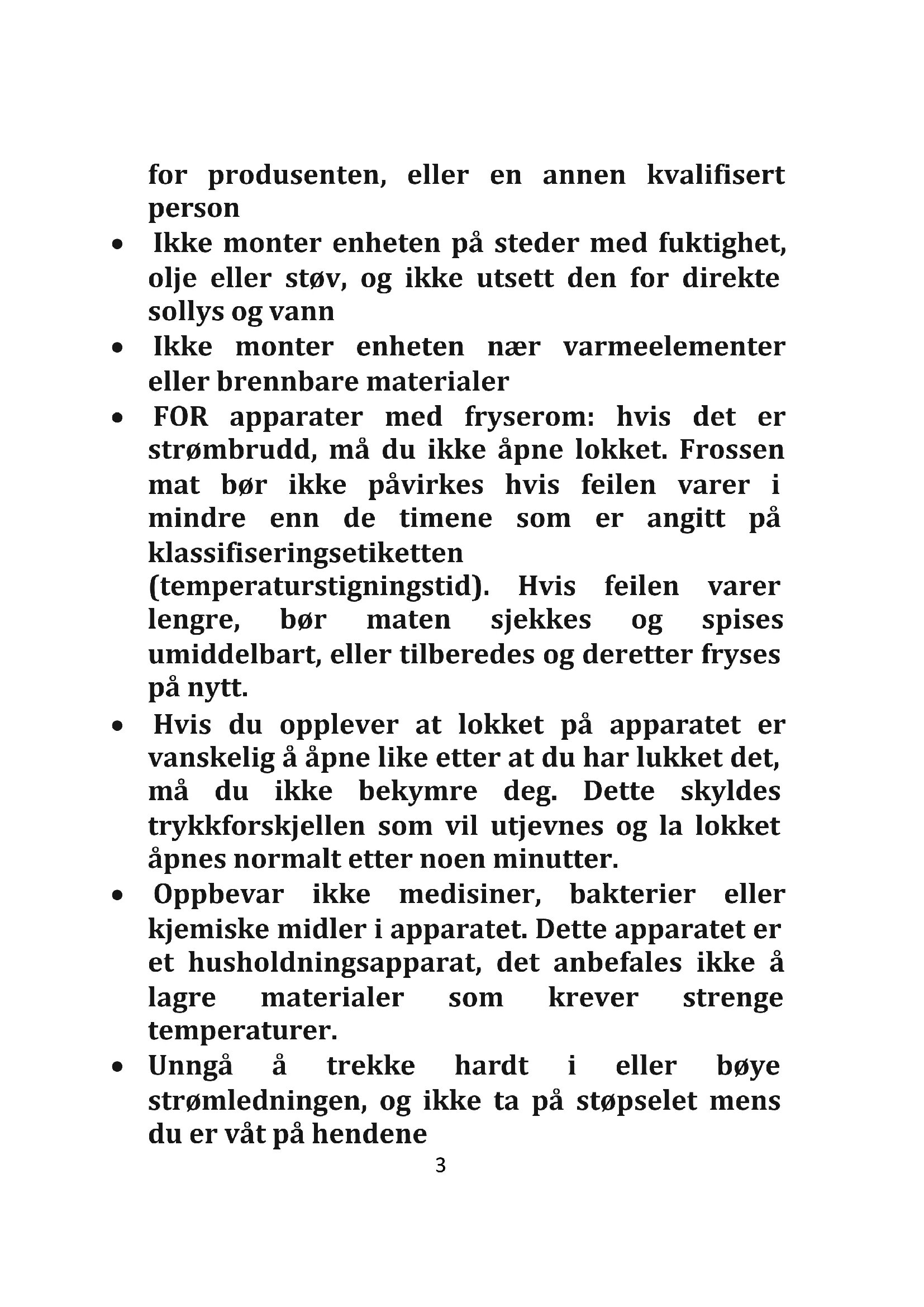 - Unngå å trekke hardt i eller bøye strømledningen, og ikke ta på støpselet mens du er våt på hendene 3• Ikke oppbevar produkter som inneholder brennbart drivmiddel (f.eks. spraybokser) eller eksplosive stoffer i apparatet. Eksplosjonsfare!
