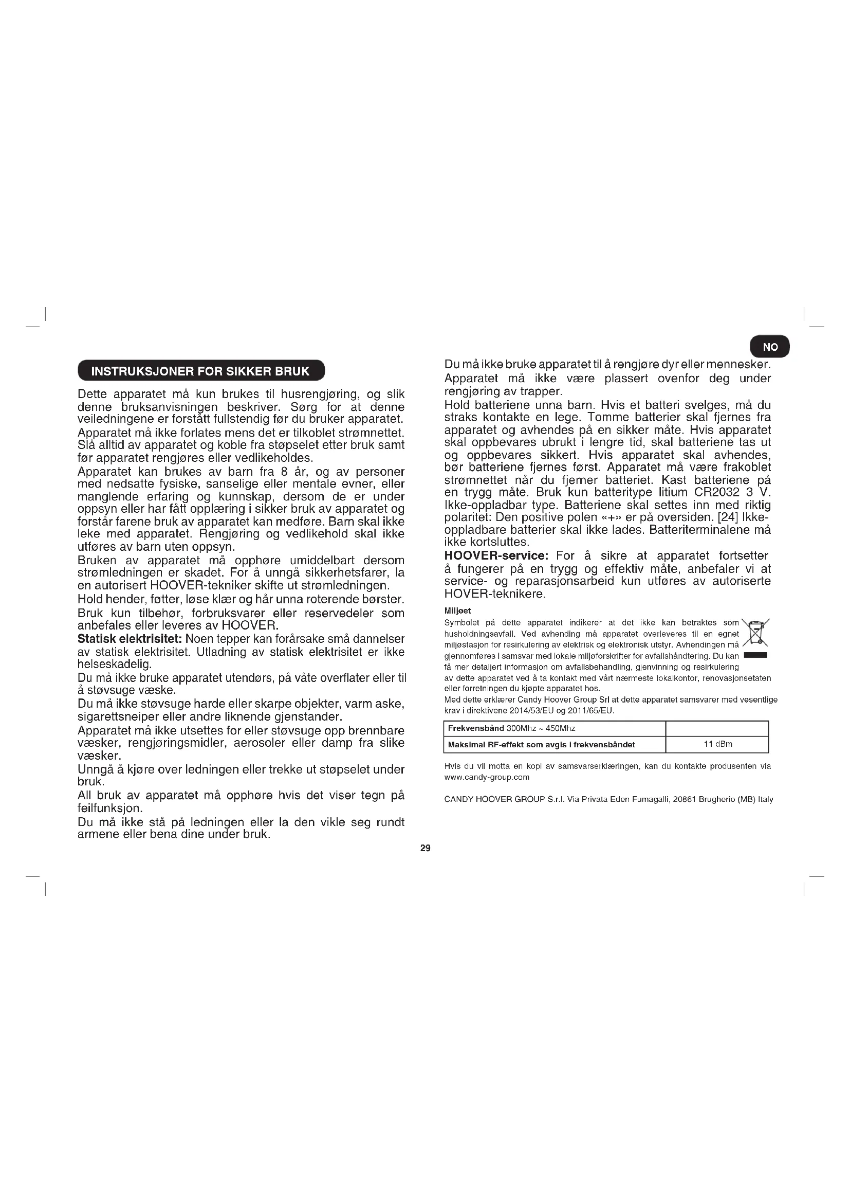 Dette apparatet må kun brukes til husrengjøring, og slik denne bruksanvisningen beskriver. Sørg for at denne veiledningene er forstått fullstendig før du bruker apparatet. Apparatet må ikke forlates mens det er tilkoblet strømnettet. Slå alltid av apparatet og koble fra støpselet etter bruk samt før apparatet rengjøres eller vedlikeholdes. Apparatet kan brukes av barn fra 8 år, og av personer med nedsatte fysiske, sanselige eller mentale evner, eller manglende erfaring og kunnskap, dersom de er under oppsyn eller har fått opplæring i sikker bruk av apparatet og forstår farene bruk av apparatet kan medføre. Barn skal ikke leke med apparatet. Rengjøring og vedlikehold skal ikke utføres av barn uten oppsyn. Bruken av apparatet må opphøre umiddelbart dersom strømledningen er skadet. For å unngå sikkerhetsfarer, la en autorisert HOOVER-tekniker skifte ut strømledningen. Hold hender, føtter, løse klær og hår unna roterende børster. Bruk kun tilbehør, forbruksvarer eller reservedeler som anbefales eller leveres av HOOVER. Statisk elektrisitet: Noen tepper kan forårsake små dannelser av statisk elektrisitet. Utladning av statisk elektrisitet er ikke helseskadelig. Du må ikke bruke apparatet utendørs, på våte overater eller til å støvsuge væske. Du må ikke støvsuge harde eller skarpe objekter, varm aske, sigarettsneiper eller andre liknende gjenstander. Apparatet må ikke utsettes for eller støvsuge opp brennbare væsker, rengjøringsmidler, aerosoler eller damp fra slike væsker. Unngå å kjøre over ledningen eller trekke ut støpselet under bruk. All bruk av apparatet må opphøre hvis det viser tegn på feilfunksjon. Du må ikke stå på ledningen eller la den vikle seg rundt armene eller bena dine under bruk. Du må ikke bruke apparatet til å rengjøre dyr eller mennesker. Apparatet må ikke være plassert ovenfor deg under rengjøring av trapper. Hold batteriene unna barn. Hvis et batteri svelges, må du straks kontakte en lege. Tomme batterier skal fjernes fra apparatet og avhendes på en sikker måte. Hvis apparatet skal oppbevares ubrukt i lengre tid, skal batteriene tas ut og oppbevares sikkert. Hvis apparatet skal avhendes, bør batteriene fjernes først. Apparatet må være frakoblet strømnettet når du fjerner batteriet. Kast batteriene på en trygg måte. Bruk kun batteritype litium CR2032 3 V. Ikke-oppladbar type. Batteriene skal settes inn med riktig polaritet: Den positive polen «+» er på oversiden. [24] Ikke- oppladbare batterier skal ikke lades. Batteriterminalene må ikke kortsluttes. HOOVER-service: For å sikre at apparatet fortsetter å fungerer på en trygg og effektiv måte, anbefaler vi at service- og reparasjonsarbeid kun utføres av autoriserte HOVER-teknikere. Miljøet Symbolet på dette apparatet indikerer at det ikke kan betraktes som husholdningsavfall. Ved avhending må apparatet overleveres til en egnet miljøstasjon for resirkulering av elektrisk og elektronisk utstyr. Avhendingen må gjennomføres i samsvar med lokale miljøforskrifter for avfallshåndtering. Du kan få mer detaljert informasjon om avfallsbehandling, gjenvinning og resirkulering av dette apparatet ved å ta kontakt med vårt nærmeste lokalkontor, renovasjonsetaten eller forretningen du kjøpte apparatet hos. Med dette erklærer Candy Hoover Group Srl at dette apparatet samsvarer med vesentlige krav i direktivene 2014/53/EU og 2011/65/EU. Hvis du vil motta en kopi av samsvarserklæringen, kan du kontakte produsenten via www.candy-group.com CANDY HOOVER GROUP S.r.l. Via Privata Eden Fumagalli, 20861 Brugherio (MB) Italy