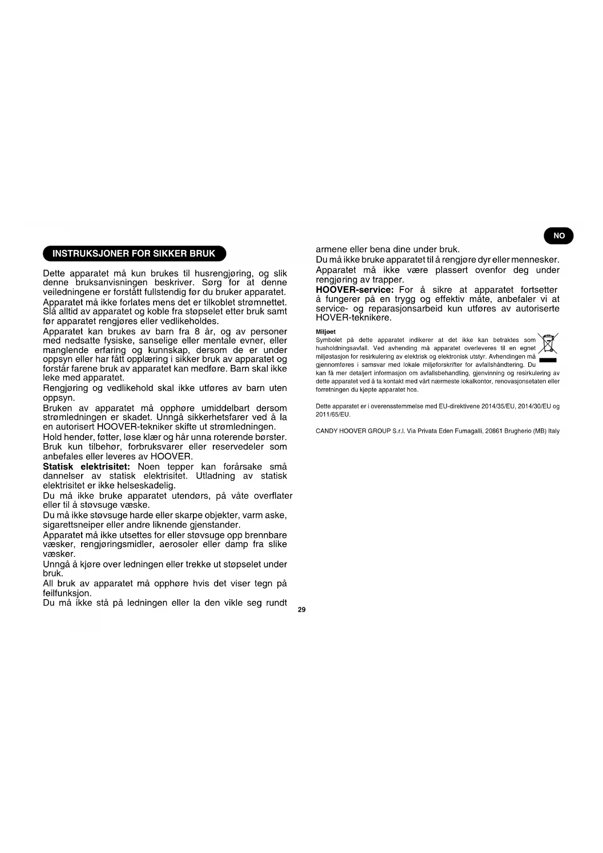 Dette apparatet må kun brukes til husrengjøring, og slik denne bruksanvisningen beskriver. Sørg for at denne veiledningene er forstått fullstendig før du bruker apparatet. Apparatet må ikke forlates mens det er tilkoblet strømnettet. Slå alltid av apparatet og koble fra støpselet etter bruk samt før apparatet rengjøres eller vedlikeholdes. Apparatet kan brukes av barn fra 8 år, og av personer med nedsatte fysiske, sanselige eller mentale evner, eller manglende erfaring og kunnskap, dersom de er under oppsyn eller har fått opplæring i sikker bruk av apparatet og forstår farene bruk av apparatet kan medføre. Barn skal ikke leke med apparatet. Rengjøring og vedlikehold skal ikke utføres av barn uten oppsyn. Bruken av apparatet må opphøre umiddelbart dersom strømledningen er skadet. Unngå sikkerhetsfarer ved å la en autorisert HOOVER-tekniker skifte ut strømledningen. Hold hender, føtter, løse klær og hår unna roterende børster. Bruk kun tilbehør, forbruksvarer eller reservedeler som anbefales eller leveres av HOOVER. Statisk elektrisitet: Noen tepper kan forårsake små dannelser av statisk elektrisitet. Utladning av statisk elektrisitet er ikke helseskadelig. Du må ikke bruke apparatet utendørs, på våte overater eller til å støvsuge væske. Du må ikke støvsuge harde eller skarpe objekter, varm aske, sigarettsneiper eller andre liknende gjenstander. Apparatet må ikke utsettes for eller støvsuge opp brennbare væsker, rengjøringsmidler, aerosoler eller damp fra slike væsker. Unngå å kjøre over ledningen eller trekke ut støpselet under bruk. All bruk av apparatet må opphøre hvis det viser tegn på feilfunksjon. Du må ikke stå på ledningen eller la den vikle seg rundt armene eller bena dine under bruk. Du må ikke bruke apparatet til å rengjøre dyr eller mennesker. Apparatet må ikke være plassert ovenfor deg under rengjøring av trapper. HOOVER-service: For å sikre at apparatet fortsetter å fungerer på en trygg og effektiv måte, anbefaler vi at service- og reparasjonsarbeid kun utføres av autoriserte HOVER-teknikere. Miljøet Symbolet på dette apparatet indikerer at det ikke kan betraktes som husholdningsavfall. Ved avhending må apparatet overleveres til en egnet miljøstasjon for resirkulering av elektrisk og elektronisk utstyr. Avhendingen må gjennomføres i samsvar med lokale miljøforskrifter for avfallshåndtering. Du kan få mer detaljert informasjon om avfallsbehandling, gjenvinning og resirkulering av dette apparatet ved å ta kontakt med vårt nærmeste lokalkontor, renovasjonsetaten eller forretningen du kjøpte apparatet hos. Dette apparatet er i overensstemmelse med EU-direktivene 2014/35/EU, 2014/30/EU og 2011/65/EU. CANDY HOOVER GROUP S.r.l. Via Privata Eden Fumagalli, 20861 Brugherio (MB) Italy30