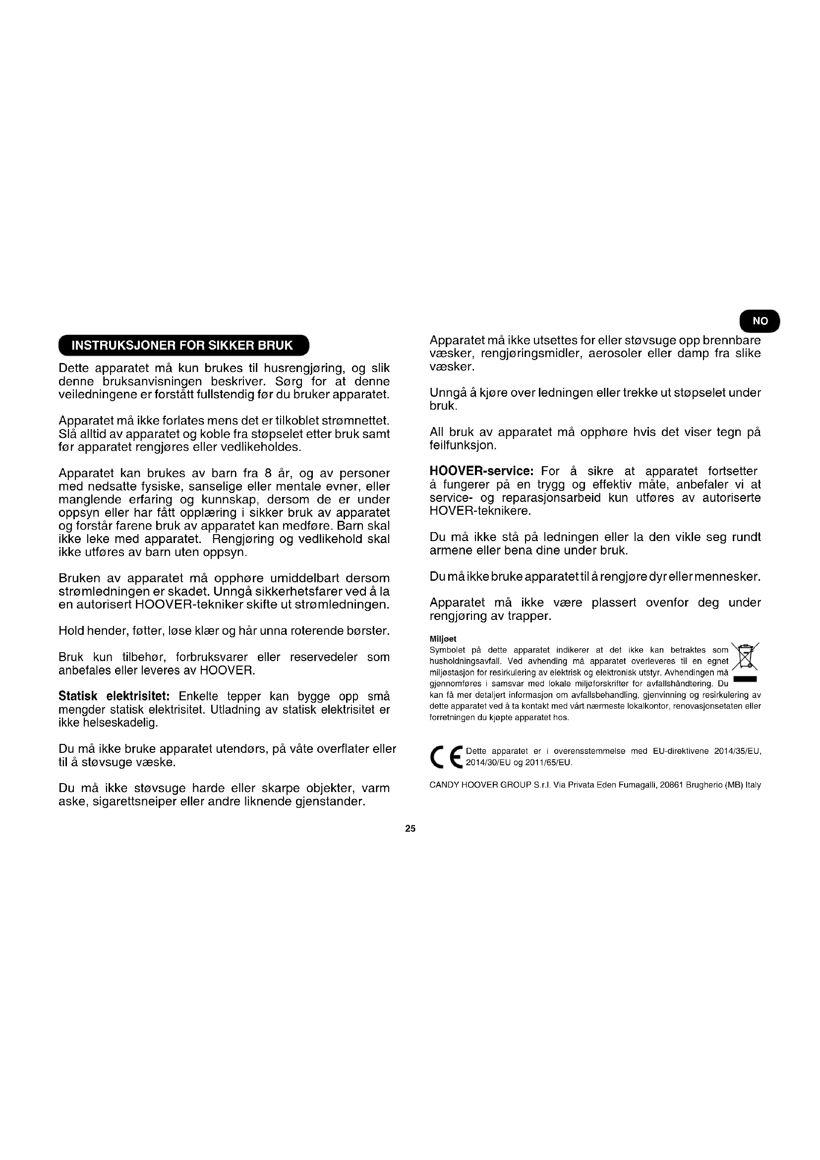 Dette apparatet må kun brukes til husrengjøring, og slik denne bruksanvisningen beskriver. Sørg for at denne veiledningene er forstått fullstendig før du bruker apparatet. Apparatet må ikke forlates mens det er tilkoblet strømnettet. Slå alltid av apparatet og koble fra støpselet etter bruk samt før apparatet rengjøres eller vedlikeholdes. Apparatet kan brukes av barn fra 8 år, og av personer med nedsatte fysiske, sanselige eller mentale evner, eller manglende erfaring og kunnskap, dersom de er under oppsyn eller har fått opplæring i sikker bruk av apparatet og forstår farene bruk av apparatet kan medføre. Barn skal ikke leke med apparatet. Rengjøring og vedlikehold skal ikke utføres av barn uten oppsyn. Bruken av apparatet må opphøre umiddelbart dersom strømledningen er skadet. Unngå sikkerhetsfarer ved å la en autorisert HOOVER-tekniker skifte ut strømledningen. Hold hender, føtter, løse klær og hår unna roterende børster. Bruk kun tilbehør, forbruksvarer eller reservedeler som anbefales eller leveres av HOOVER. Statisk elektrisitet: Enkelte tepper kan bygge opp små mengder statisk elektrisitet. Utladning av statisk elektrisitet er ikke helseskadelig. Du må ikke bruke apparatet utendørs, på våte overater eller til å støvsuge væske. Du må ikke støvsuge harde eller skarpe objekter, varm aske, sigarettsneiper eller andre liknende gjenstander. Apparatet må ikke utsettes for eller støvsuge opp brennbare væsker, rengjøringsmidler, aerosoler eller damp fra slike væsker. Unngå å kjøre over ledningen eller trekke ut støpselet under bruk. All bruk av apparatet må opphøre hvis det viser tegn på feilfunksjon. HOOVER-service: For å sikre at apparatet fortsetter å fungerer på en trygg og effektiv måte, anbefaler vi at service- og reparasjonsarbeid kun utføres av autoriserte HOVER-teknikere. Du må ikke stå på ledningen eller la den vikle seg rundt armene eller bena dine under bruk. Du må ikke bruke apparatet til å rengjøre dyr eller mennesker. Apparatet må ikke være plassert ovenfor deg under rengjøring av trapper. Miljøet Symbolet på dette apparatet indikerer at det ikke kan betraktes som husholdningsavfall. Ved avhending må apparatet overleveres til en egnet miljøstasjon for resirkulering av elektrisk og elektronisk utstyr. Avhendingen må gjennomføres i samsvar med lokale miljøforskrifter for avfallshåndtering. Du kan få mer detaljert informasjon om avfallsbehandling, gjenvinning og resirkulering av dette apparatet ved å ta kontakt med vårt nærmeste lokalkontor, renovasjonsetaten eller forretningen du kjøpte apparatet hos. Dette apparatet er i overensstemmelse med EU-direktivene 2014/35/EU, 2014/30/EU og 2011/65/EU. CANDY HOOVER GROUP S.r.l. Via Privata Eden Fumagalli, 20861 Brugherio (MB) Italy NO26