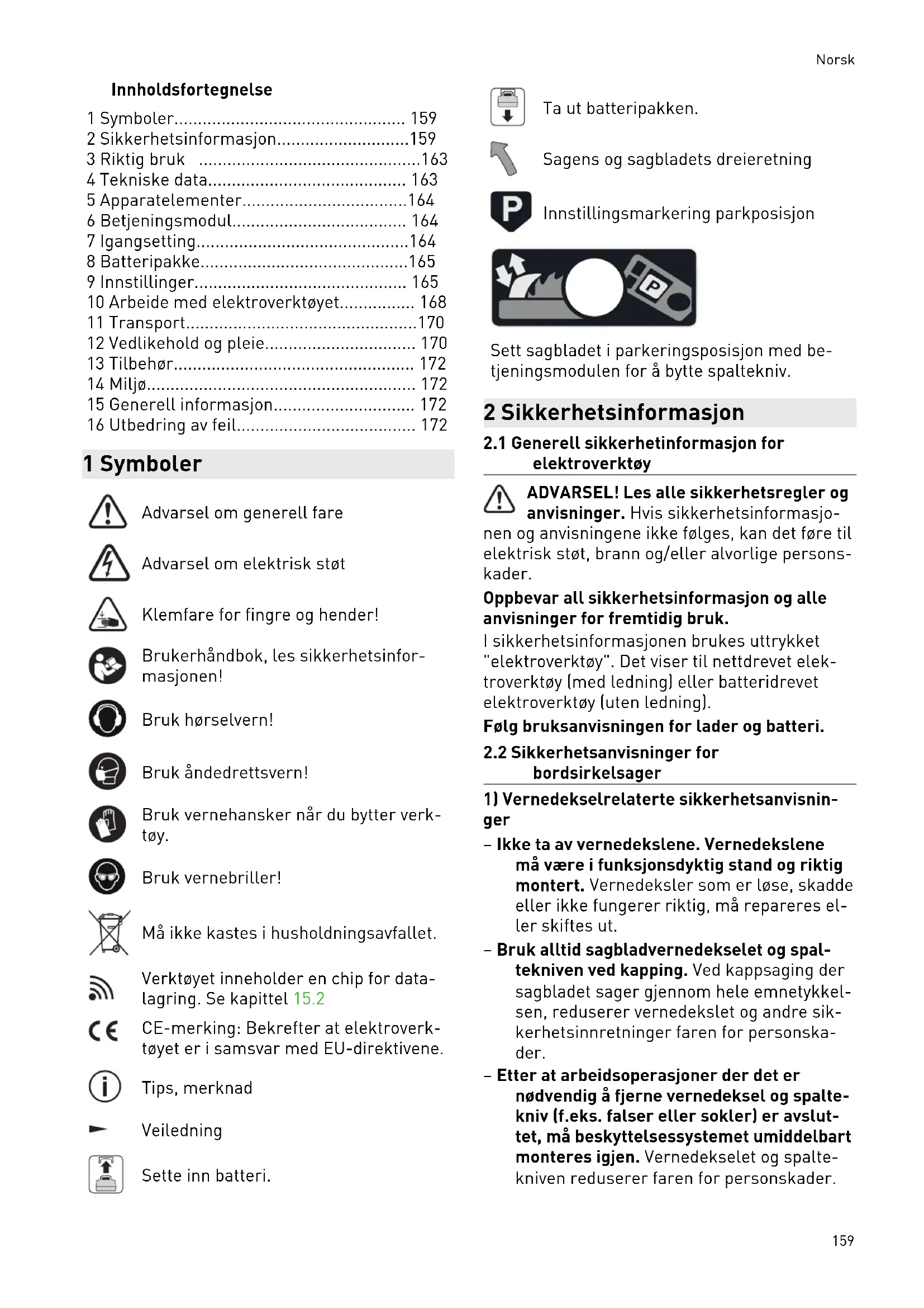 bordsirkelsager – Slå av bordsirkelsagen og koble den fra batteriet før du fjerner bordinnsatsen, skifter sagblad, foretar innstillinger på spaltekniven eller sagbladets vernedeksel og hvis du setter fra deg maskinen uten tilsyn. Sikkerhetstiltak bidrar til å hindre uhell. – La aldri bordsirkelsagen gå uten tilsyn. Slå av elektroverktøyet, og forlat det ikke før det har stoppet helt. En sag som går uten tilsyn, representerer en ukontrollert fare. – Plasser bordsirkelsagen på et sted med plant underlag og god ventilasjon, og der du kan stå sikkert og stabilt. Oppstillings stedet nå være stort nok til at du uten pro blemer kan håndtere emnene. Uryddige arbeidsområder uten lys og ujevne, glatte underlag kan føre til ulykker. – Fjern jevnlig sagflis og sagmugg under sagbordet og/eller på støvavsuget. Opp samlet sagmugg er brennbart og kan selv antenne. – Sikre bordsirkelsagen. Hvis bordsirkelsa gen ikke er riktig sikret, kan den bevege seg eller velte. – Fjern innstillingsverktøy, trebiter osv. fra bordsirkelsagen før du slå den på. For styrrelser eller blokkering kan være farlig. – Bruk alltid sagblad i riktig størrelse og med passende festeåpning (f.eks. stjerne formet eller rund). Sagblader som ikke passer til monteringsdelene på sagene, vil rotere ujevnt og føre til tap av kontroll. – Bruk aldri skadd eller feil monteringsma teriell for sagblad, for eksempel flenser, mellomleggsskiver, skruer eller muttere . Dette monteringsmateriellet for sagblad er Norsk 161konstruert spesielt for din sag, for sikker drift og optimal ytelse. – Stå aldri på bordsirkelsagen, og bruk ikke bordsirkelsagen som krakk. Det kan opp stå alvorlige personskader hvis elektro verktøyet velter eller hvis du berører sag bladet. – Kontroller at sagbladet er montert i riktig rotasjonsretning. Bruk ikke slipeskiver el ler stålbørster på bordsirkelsagen. Ikke- forskriftsmessig montering av sagbladet eller bruk av tilbehør som ikke er anbefalt kan føre til alvorlige personskader.