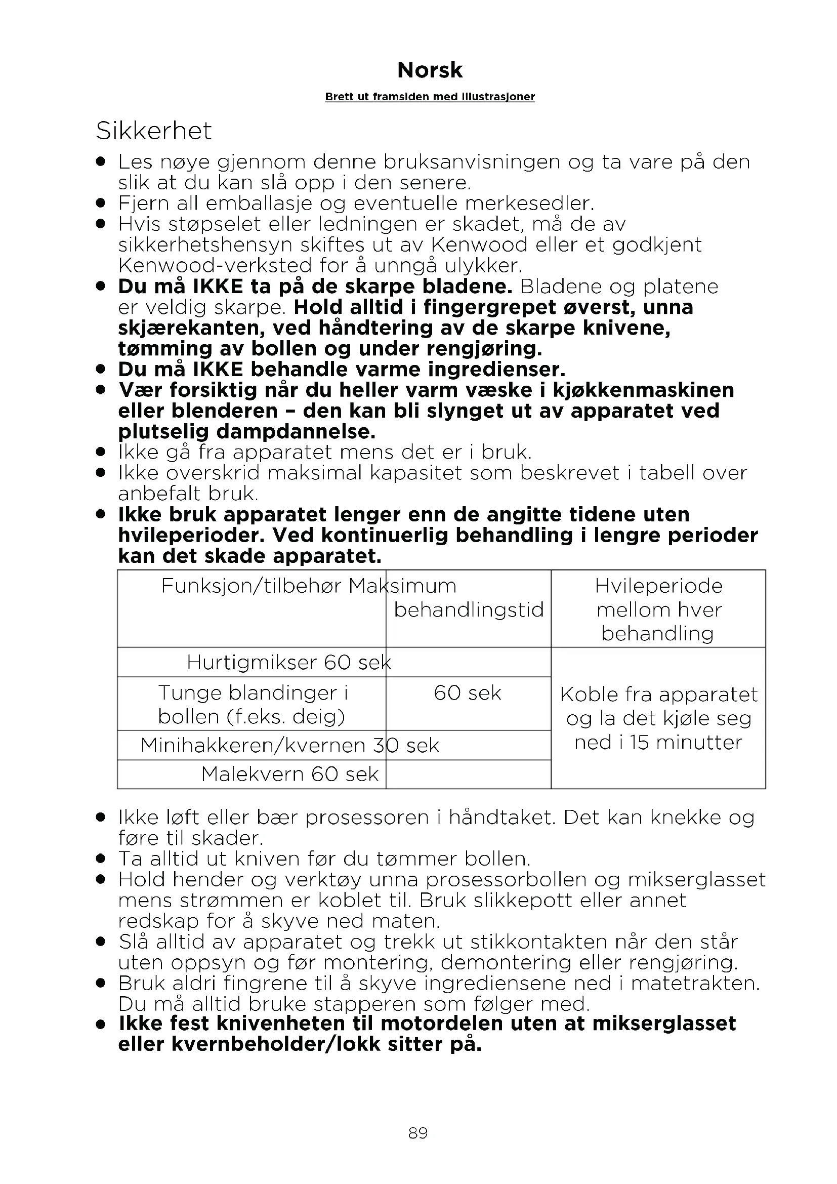 Ikke bruk apparatet lenger enn de angitte tidene uten hvileperioder. Ved kontinuerlig behandling i lengre perioder kan det skade apparatet. Funksjon/tilbehør Maksimum behandlingstid Hvileperiode mellom hver behandling Hurtigmikser 60 sek Koble fra apparatet og la det kjøle seg ned i 15 minutter Tunge blandinger i bollen (f.eks. deig) 60 sek Minihakkeren/kvernen 30 sek Malekvern 60 sek