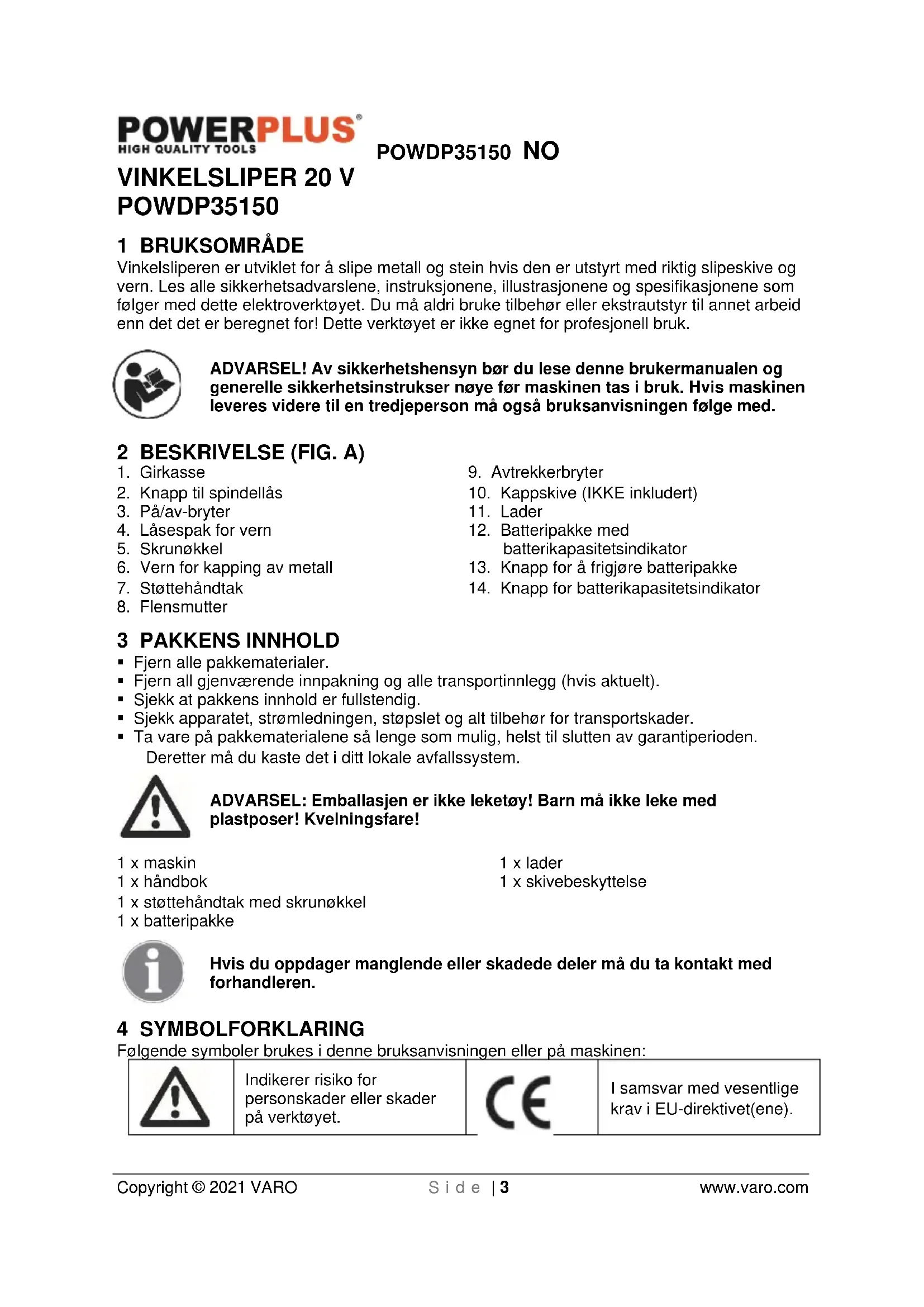 Copyright © 2021 VARO S i d e | 3 www.varo.com VINKELSLIPER 20 V POWDP35150 1 BRUKSOMRÅDE Vinkelsliperen er utviklet for å slipe metall og stein hvis den er utstyrt med riktig slipeskive og vern. Les alle sikkerhetsadvarslene, instruksjonene, illustrasjonene og spesifikasjonene som følger med dette elektroverktøyet. Du må aldri bruke tilbehør eller ekstrautstyr til annet arbeid enn det det er beregnet for! Dette verktøyet er ikke egnet for profesjonell bruk. ADVARSEL! Av sikkerhetshensyn bør du lese denne brukermanualen og generelle sikkerhetsinstrukser nøye før maskinen tas i bruk. Hvis maskinen leveres videre til en tredjeperson må også bruksanvisningen følge med. 2 BESKRIVELSE (FIG. A)