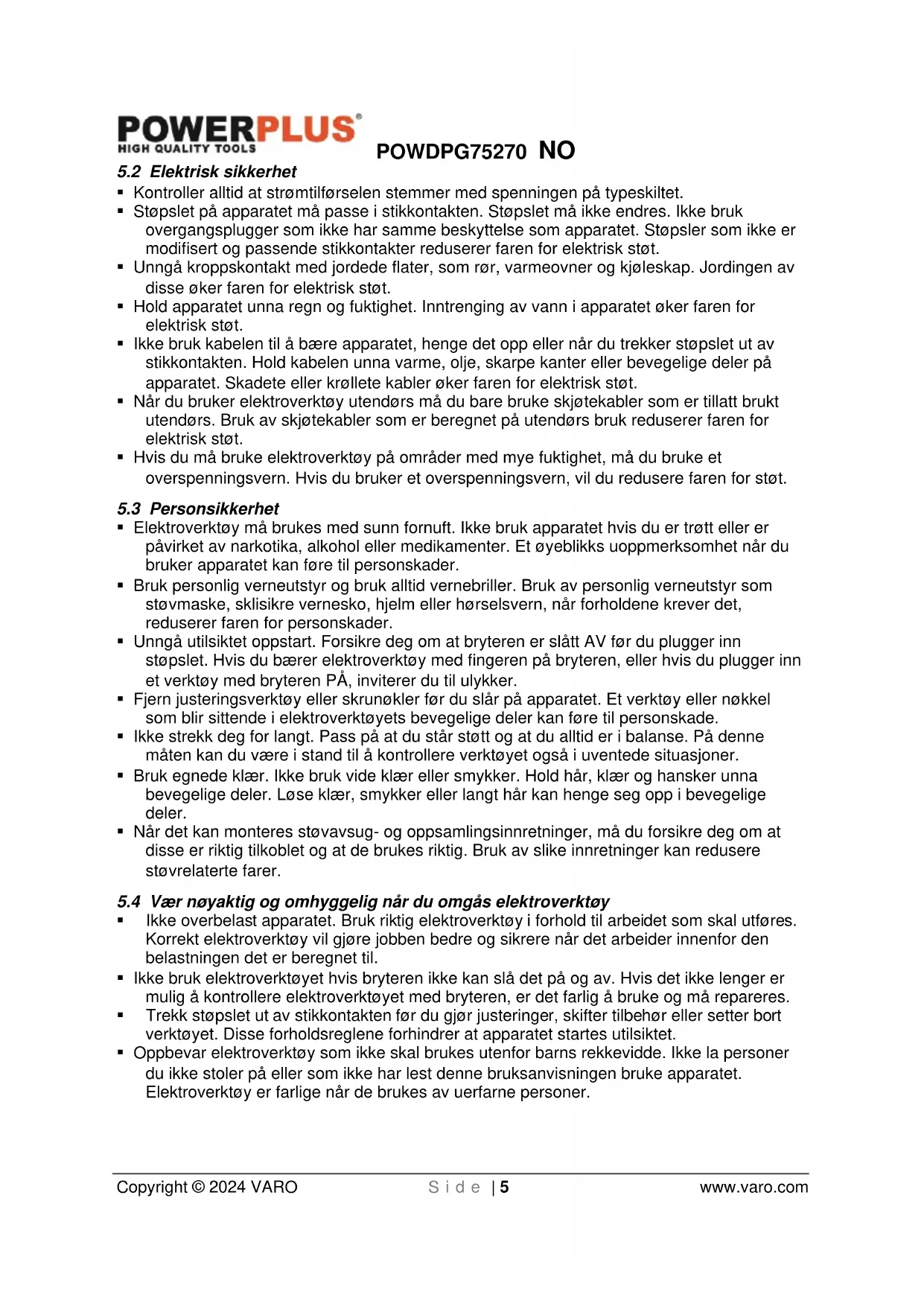 - Oppbevar elektroverktøy som ikke skal brukes utenfor barns rekkevidde. Ikke la personer du ikke stoler på eller som ikke har lest denne bruksanvisningen bruke apparatet. Elektroverktøy er farlige når de brukes av uerfarne personer.POWDPG75270 NO Copyright © 2024 VARO S i d e | 6 www.varo.com