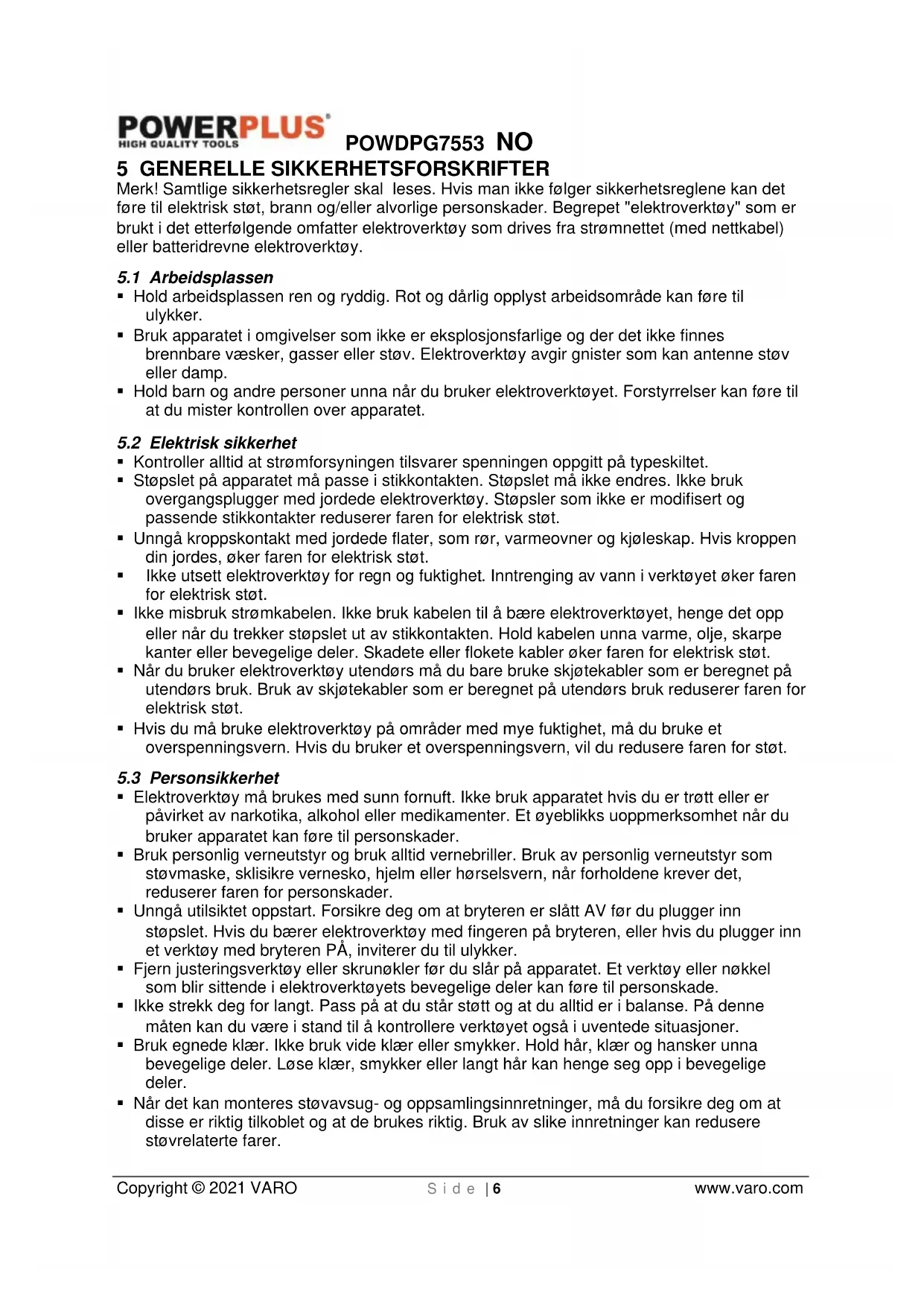 Bruk pustebeskyttelse ved støvutvikling.POWDPG7553 NO Copyright © 2021 VARO S i d e | 6 www.varo.com 5 GENERELLE SIKKERHETSFORSKRIFTER Merk! Samtlige sikkerhetsregler skal leses. Hvis man ikke følger sikkerhetsreglene kan det føre til elektrisk støt, brann og/eller alvorlige personskader. Begrepet "elektroverktøy" som er brukt i det etterfølgende omfatter elektroverktøy som drives fra strømnettet (med nettkabel) eller batteridrevne elektroverktøy.