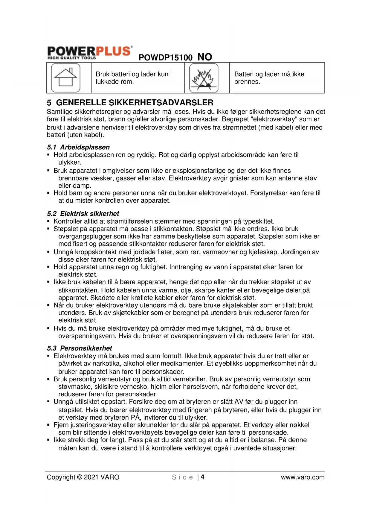 - Følg alle ladeinstruksjonene og unngå å lade batteripakken utenfor temperaturområdet som står spesifisert i instruksjonene. Feil lading eller lading utenfor angitt temperaturområde øker risikoen for brann.POWDP15100 NO Copyright © 2021 VARO S i d e | 6 www.varo.com