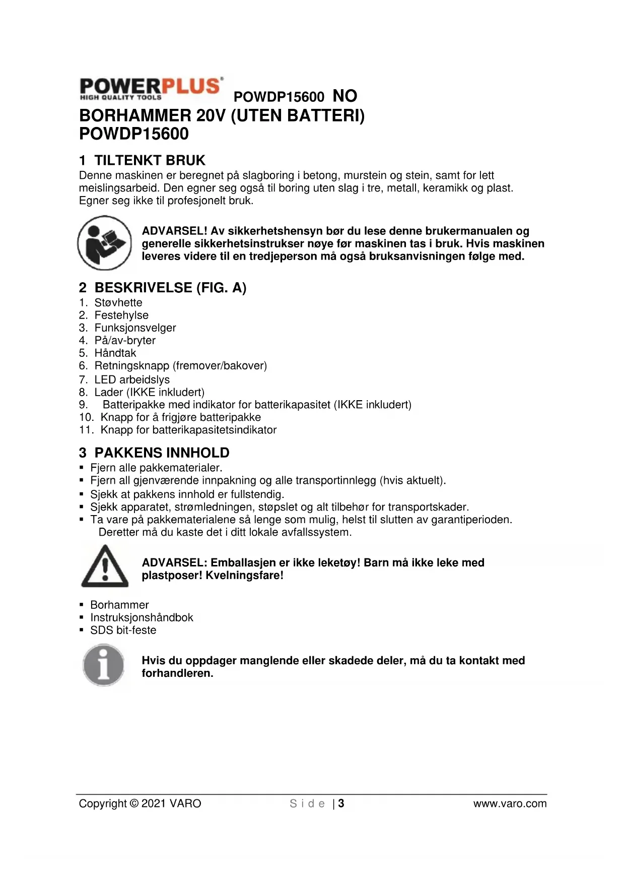 - Verktøyet må returneres til din forhandler (uten demontering) i en akseptabel, ren tilstand (i originalemballasjen), sammen med kvittering på kjøpet.POWDP15600 NO Copyright © 2021 VARO S i d e | 12 www.varo.com