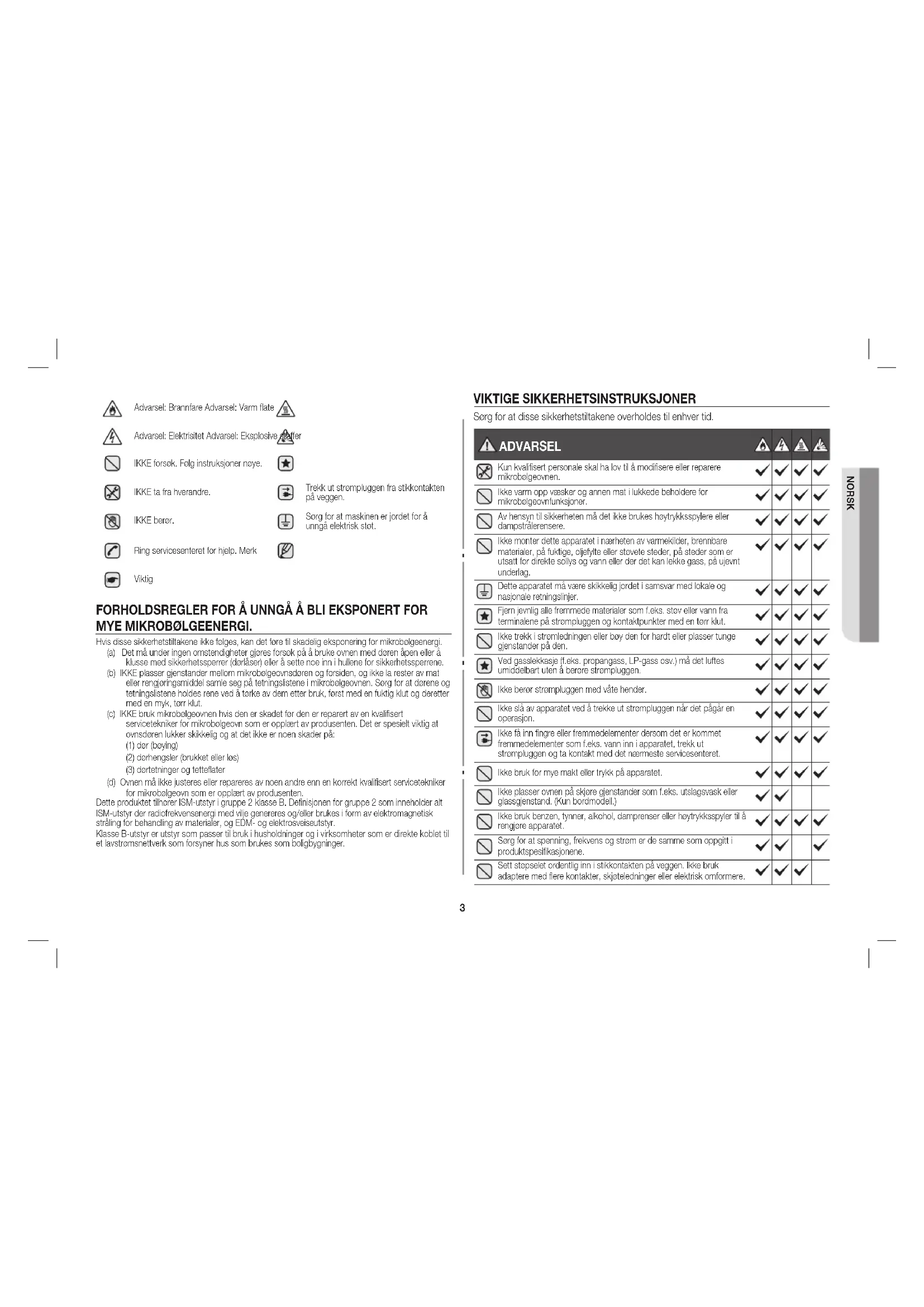 MYE MIKROBØLGEENERGI. Hvis disse sikkerhetstiltakene ikke følges, kan det føre til skadelig eksponering for mikrobølgeenergi. (a) Det må under ingen omstendigheter gjøres forsøk på å bruke ovnen med døren åpen eller å klusse med sikkerhetssperrer (dørlåser) eller å sette noe inn i hullene for sikkerhetssperrene. (b) IKKE plasser gjenstander mellom mikrobølgeovnsdøren og forsiden, og ikke la rester av mat eller rengjøringsmiddel samle seg på tetningslistene i mikrobølgeovnen. Sørg for at dørene og tetningslistene holdes rene ved å tørke av dem etter bruk, først med en fuktig klut og deretter med en myk, tørr klut. (c) IKKE bruk mikrobølgeovnen hvis den er skadet før den er reparert av en kvalifisert servicetekniker for mikrobølgeovn som er opplært av produsenten. Det er spesielt viktig at ovnsdøren lukker skikkelig og at det ikke er noen skader på: (1) dør (bøying) (2) dørhengsler (brukket eller løs) (3) dørtetninger og tetteflater (d) Ovnen må ikke justeres eller repareres av noen andre enn en korrekt kvalifisert servicetekniker for mikrobølgeovn som er opplært av produsenten. Dette produktet tilhører ISM-utstyr i gruppe 2 klasse B. Definisjonen for gruppe 2 som inneholder alt ISM-utstyr der radiofrekvensenergi med vilje genereres og/eller brukes i form av elektromagnetisk stråling for behandling av materialer, og EDM- og elektrosveiseutstyr. Klasse B-utstyr er utstyr som passer til bruk i husholdninger og i virksomheter som er direkte koblet til et lavstrømsnettverk som forsyner hus som brukes som boligbygninger. VIKTIGE SIKKERHETSINSTRUKSJONER Sørg for at disse sikkerhetstiltakene overholdes til enhver tid. ADVARSEL Kun kvalifisert personale skal ha lov til å modifisere eller reparere mikrobølgeovnen. Ikke varm opp væsker og annen mat i lukkede beholdere for mikrobølgeovnfunksjoner. Av hensyn til sikkerheten må det ikke brukes høytrykksspylere eller dampstrålerensere. Ikke monter dette apparatet i nærheten av varmekilder, brennbare materialer, på fuktige, oljefylte eller støvete steder, på steder som er utsatt for direkte sollys og vann eller der det kan lekke gass, på ujevnt underlag. Dette apparatet må være skikkelig jordet i samsvar med lokale og nasjonale retningslinjer. Fjern jevnlig alle fremmede materialer som f.eks. støv eller vann fra terminalene på strømpluggen og kontaktpunkter med en tørr klut. Ikke trekk i strømledningen eller bøy den for hardt eller plasser tunge gjenstander på den. Ved gasslekkasje (f.eks. propangass, LP-gass osv.) må det luftes umiddelbart uten å berøre strømpluggen. Ikke berør strømpluggen med våte hender. Ikke slå av apparatet ved å trekke ut strømpluggen når det pågår en operasjon. Ikke få inn fingre eller fremmedelementer dersom det er kommet fremmedelementer som f.eks. vann inn i apparatet, trekk ut strømpluggen og ta kontakt med det nærmeste servicesenteret. Ikke bruk for mye makt eller trykk på apparatet. Ikke plasser ovnen på skjøre gjenstander som f.eks. utslagsvask eller glassgjenstand. (Kun bordmodell.) Ikke bruk benzen, tynner, alkohol, damprenser eller høytrykksspyler til å rengjøre apparatet. Sørg for at spenning, frekvens og strøm er de samme som oppgitt i produktspesifikasjonene. Sett støpselet ordentlig inn i stikkontakten på veggen. Ikke bruk adaptere med flere kontakter, skjøteledninger eller elektrisk omformere.4 NORSK ADVARSEL: Det er farlig for andre enn kyndige personer å utføre service eller reparasjoner der det er nødvendig å fjerne et deksel som beskytter mot mikrobølgeenergi. ADVARSEL: Kontroller at apparatet er slått av før du skifter lyspæren for å unngå muligheten for elektrisk støt. ADVARSEL: Mat og drikke må ikke varmes opp i lukkede beholdere. Disse kan eksplodere. ADVARSEL: Tilgjengelige deler kan bli varme under bruk. Små barn må holdes unna for å unngå forbrenninger. ADVARSEL: Oppvarming av drikkevarer i mikrobølgeovn kan medføre forsinket eksplosiv koking, vær derfor forsiktig ved håndtering av beholderen. For å forhindre denne situasjonen må det ALLTID ventes minst 20 sekunder etter at ovnen er slått av, slik at temperaturen kan utjevnes. Rør under oppvarming, om nødvendig, og rør ALLTID etter oppvarming. Hvis du brenner deg, må du følge disse FØRSTEHJELP-instruksjonene: