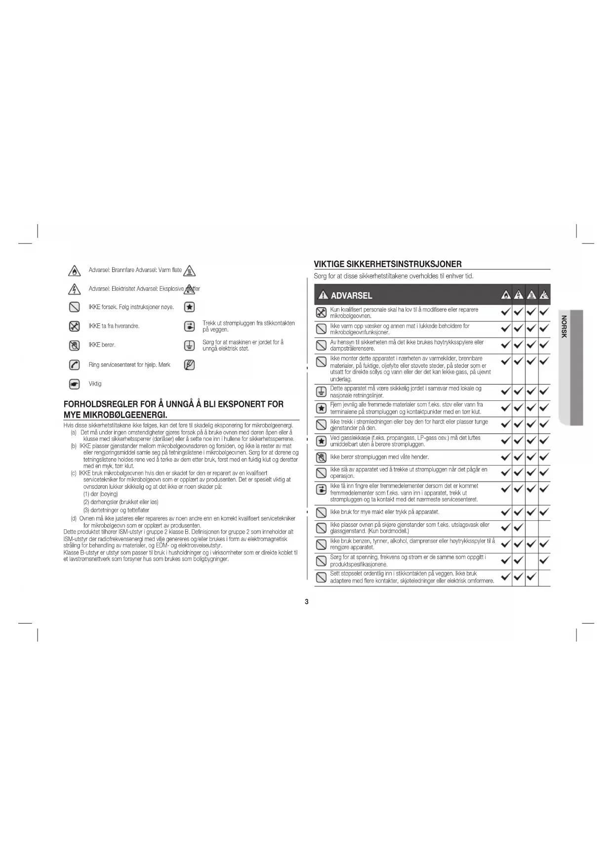 www.samsung.com/bg/supportMikrobølgeovn (HANDELSVARE) Brukerveiledning og Tilberedningsveiledning MJ26A6093 (1850 WATT) MJ26A6053 (1500 WATT) Vær oppmerksom på at Samsung-garantien IKKE dekker servicetelefoner for å forklare drift av produktet, riktig eller feil installering eller utføring av normal rengjøring eller vedlikehold. se for deg mulighetene Takk for at du valgte dette Samsung-produktet.2 NORSK