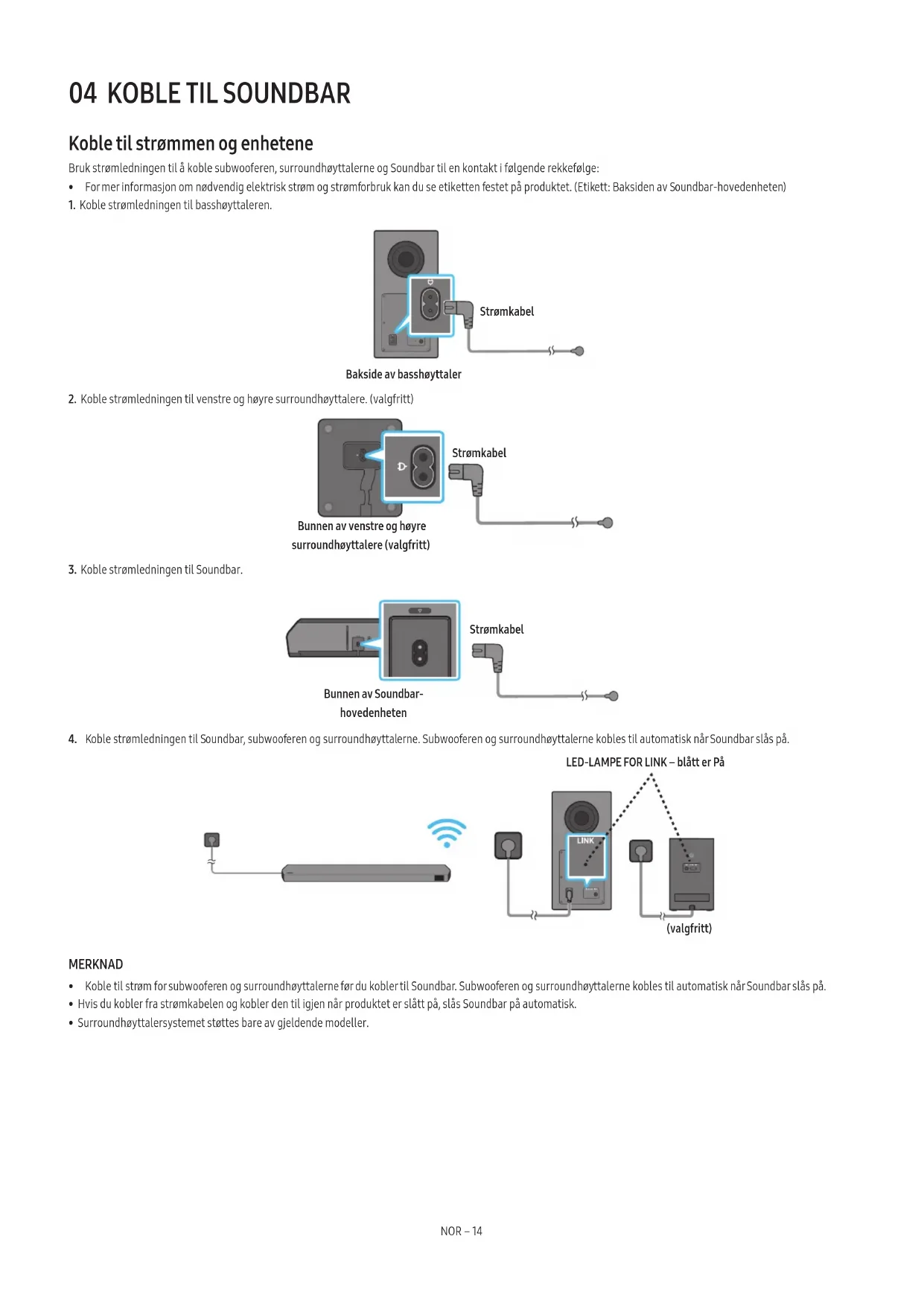 - Koble til strøm for subwooferen og surroundhøyttalerne før du kobler til Soundbar. Subwooferen og surroundhøyttalerne kobles til automatisk når Soundbar slås på.