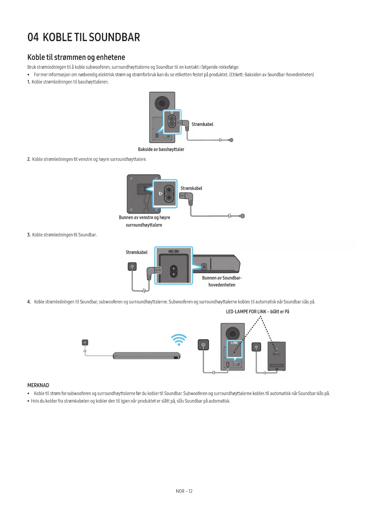 - Koble til strøm for subwooferen og surroundhøyttalerne før du kobler til Soundbar. Subwooferen og surroundhøyttalerne kobles til automatisk når Soundbar slås på.