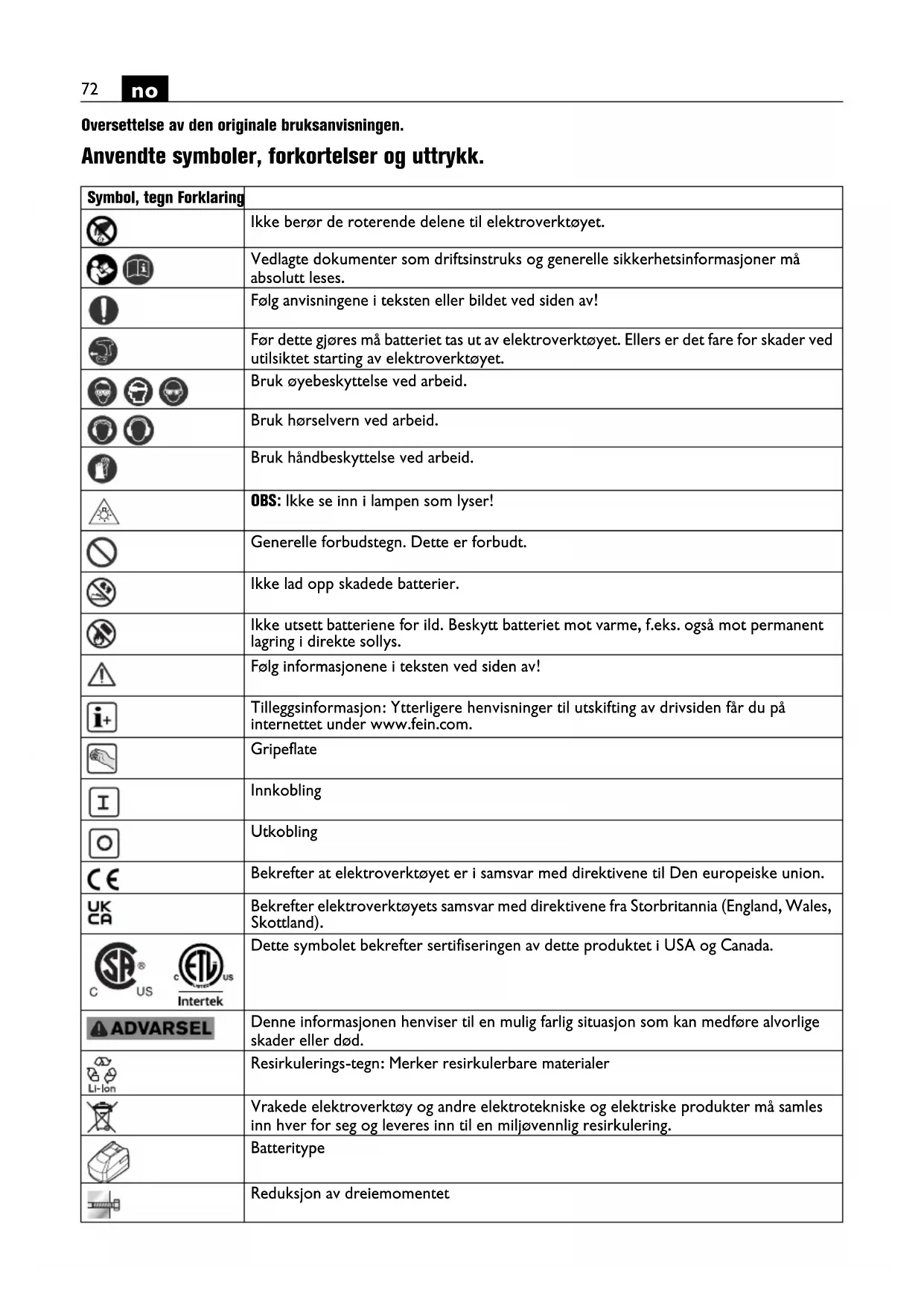 Oversettelse av den originale bruksanvisningen. Anvendte symboler, forkortelser og uttrykk. Symbol, tegn Forklaring Ikke berør de roterende delene til elektroverktøyet. Vedlagte dokumenter som driftsinstruks og generelle sikkerhetsinformasjoner må absolutt leses. Følg anvisningene i teksten eller bildet ved siden av! Før dette gjøres må batteriet tas ut av elektroverktøyet. Ellers er det fare for skader ved utilsiktet starting av elektroverktøyet. Bruk øyebeskyttelse ved arbeid. Bruk hørselvern ved arbeid. Bruk håndbeskyttelse ved arbeid. OBS: Ikke se inn i lampen som lyser! Generelle forbudstegn. Dette er forbudt. Ikke lad opp skadede batterier. Ikke utsett batteriene for ild. Beskytt batteriet mot varme, f.eks. også mot permanent lagring i direkte sollys. Følg informasjonene i teksten ved siden av! Tilleggsinformasjon: Ytterligere henvisninger til utskifting av drivsiden får du på internettet under www.fein.com. Gripeflate Innkobling Utkobling Bekrefter at elektroverktøyet er i samsvar med direktivene til Den europeiske union. Bekrefter elektroverktøyets samsvar med direktivene fra Storbritannia (England, Wales, Skottland). Dette symbolet bekrefter sertifiseringen av dette produktet i USA og Canada. Denne informasjonen henviser til en mulig farlig situasjon som kan medføre alvorlige skader eller død. Resirkulerings-tegn: Merker resirkulerbare materialer Vrakede elektroverktøy og andre elektrotekniske og elektriske produkter må samles inn hver for seg og leveres inn til en miljøvennlig resirkulering. Batteritype Reduksjon av dreiemomentet73