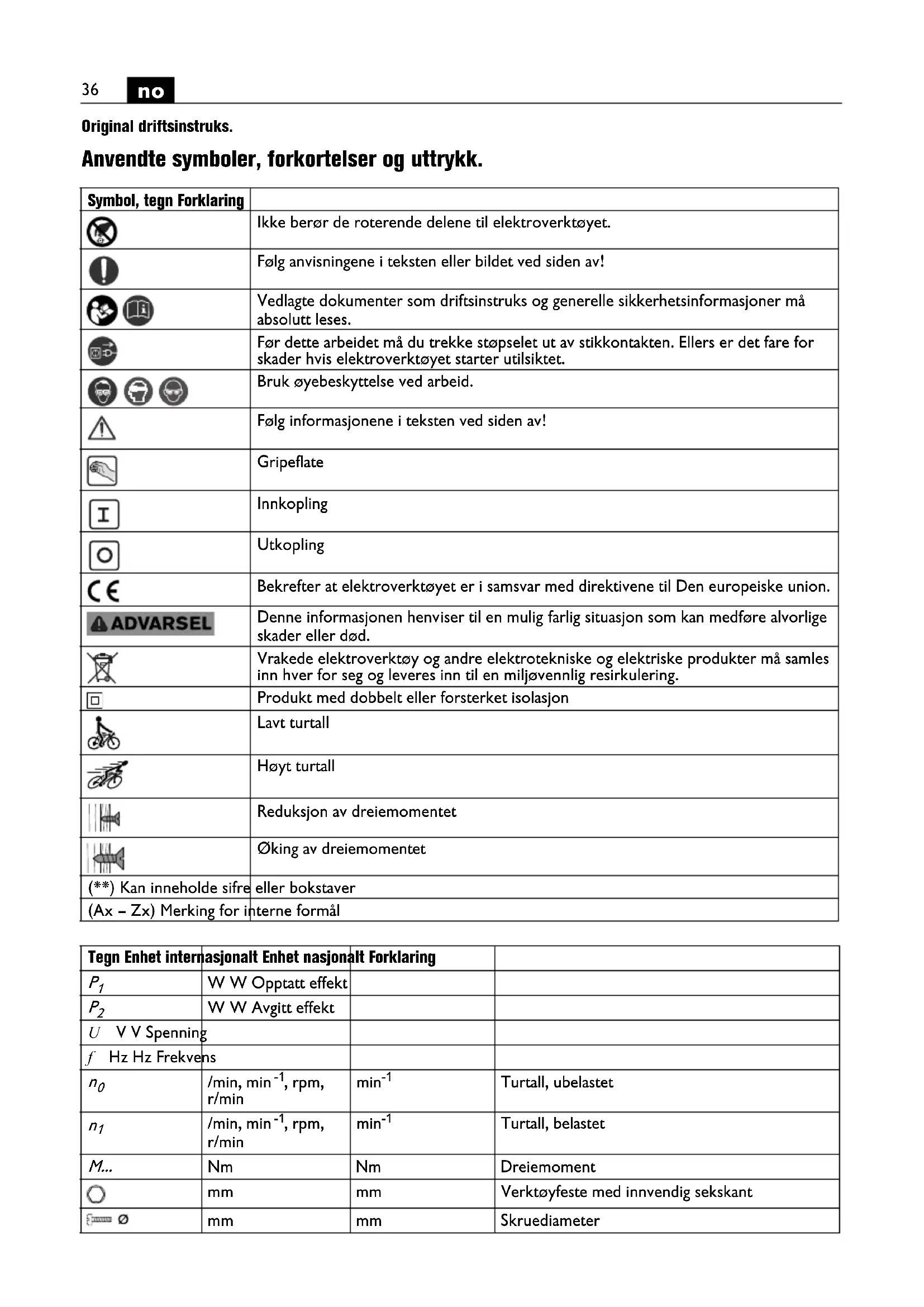 Original driftsinstruks. Anvendte symboler, forkortelser og uttrykk. Symbol, tegn Forklaring Ikke berør de roterende delene til elektroverktøyet. Følg anvisningene i teksten eller bildet ved siden av! Vedlagte dokumenter som driftsinstruks og generelle sikkerhetsinformasjoner må absolutt leses. Før dette arbeidet må du trekke støpselet ut av stikkontakten. Ellers er det fare for skader hvis elektroverktøyet starter utilsiktet. Bruk øyebeskyttelse ved arbeid. Følg informasjonene i teksten ved siden av! Gripeflate Innkopling Utkopling Bekrefter at elektroverktøyet er i samsvar med direktivene til Den europeiske union. Denne informasjonen henviser til en mulig farlig situasjon som kan medføre alvorlige skader eller død. Vrakede elektroverktøy og andre elektrotekniske og elektriske produkter må samles inn hver for seg og leveres inn til en miljøvennlig resirkulering. Produkt med dobbelt eller forsterket isolasjon Lavt turtall Høyt turtall Reduksjon av dreiemomentet Øking av dreiemomentet (**) Kan inneholde sifre eller bokstaver (Ax – Zx) Merking for interne formål Tegn Enhet internasjonalt Enhet nasjonalt Forklaring