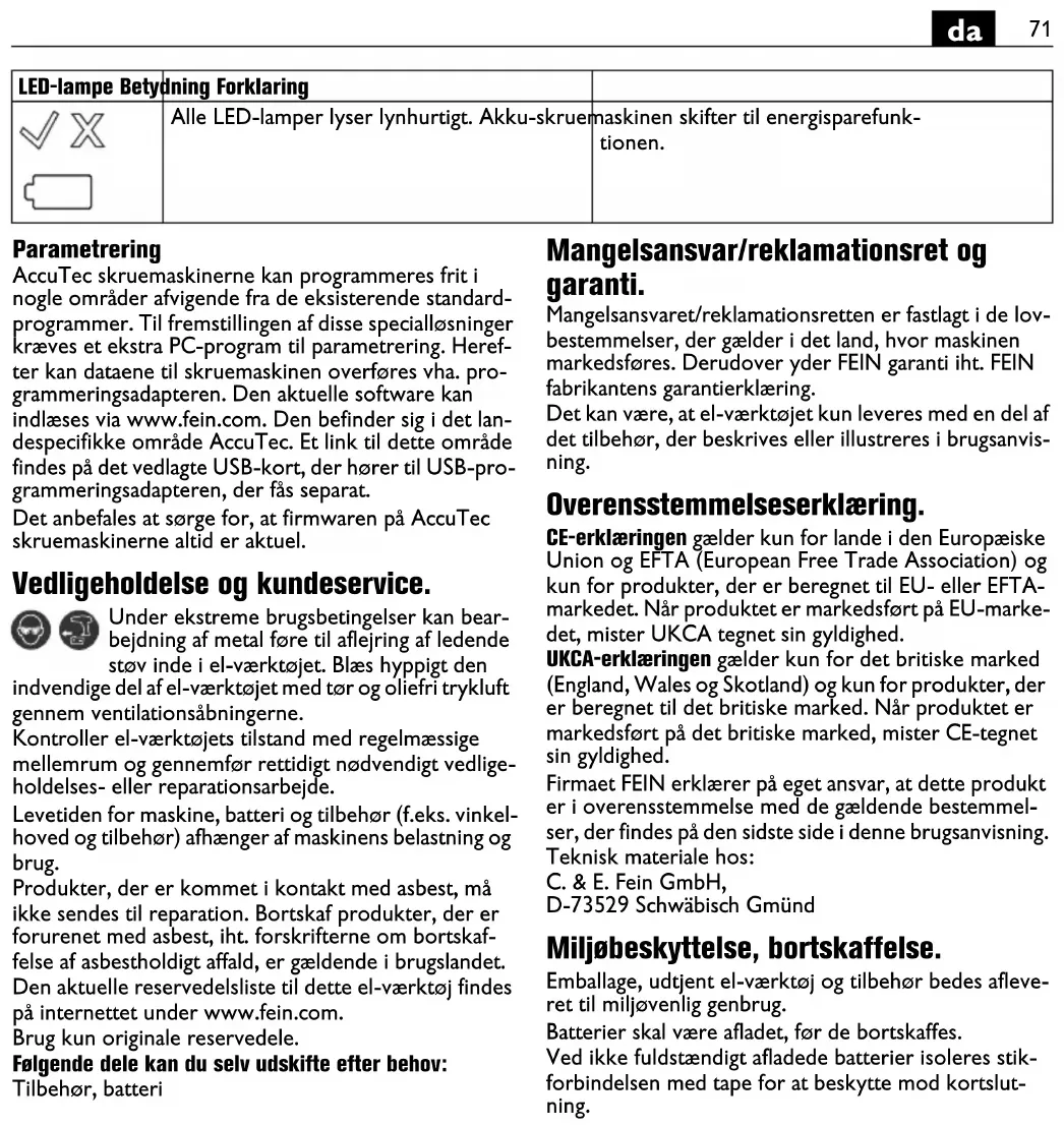 Parametrering AccuTec skrutrekkere kan avvikende fra de eksiste- rende standard-programmene i noen områder pro- grammeres fritt. For å lage disse spesielle løsninger er det nødvendig med et ekstra PC-program for parame- treringen. Med programmeringsadapteren kan deretter dataene overføres til skrutrekkeren. Den aktuelle pro- gramvaren kan lastes via internettet hos FEIN på www.fein.com. Den befinner seg i det landsspesifikke området AccuTec. En lenke til dette området befinner seg på det vedlagte USB-kortet til programmeringsa- dapteren som fås separat. Vi anbefaler å oppdatere firmwaren på din AccuTec skrutrekker regelmessig. Vedlikehold og kundeservice. Ved ekstreme bruksvilkår kan det ved bear- beidelse av metall sette seg metallstøv inne i elektroverktøyet. Dette kan forårsake kort- slutning eller overslag. Blås ofte gjennom de innvendige delene av elektroverktøyet gjennom ventilasjonsspal- tene med tørr og oljefri trykkluft. Kontroller regelmessig elektroverktøyets tilstand og sørg i rett tid for nødvendige vedlikeholds- eller repa- rasjonsarbeider. Levetiden til maskin, batteri og tilbehør (f.eks. vinkel- hode og innsatsverktøy) er avhengig av maskinens belastning og bruk. Produkter som har vært i kontakt med asbest, må ikke sendes til reparasjon. Håndter produkter kontaminert med asbest i henhold til de gyldige nasjonale bestem- melsene for asbestholdig avfall. Den aktuelle reservedelslisten for dette elektroverk- tøyet finner du på internettet under www.fein.com. Bruk kun originale reservedeler. Følgende deler kan du skifte ut selv etter behov: Innsatsverktøyer, batteri, tilbehør Reklamasjonsrett og garanti. Reklamasjonsretten for produktet gjelder jf. de lovmes- sige bestemmelsene i det landet produktet selges i. Ut over dette yter FEIN garanti i henhold til FEIN-produ- sentens garantierklæring. Denne driftsinstruksen kan inneholde beskrivelser og/eller illustrasjoner av tilbehør som ikke inngår i din leveranse. Samsvarserklæring. CE-erklæringen gjelder kun for land i Den europeiske unionen og i EFTA [EØS] (European Free Trade Asso- ciation) og kun for produkter som er bestemt for mar- kedet i EU eller EFTA. Etter at produktet er introdusert på EU-markedet, mister UKCA-merket sin gyldighet. UKCA-erklæringen gjelder kun for det britiske markedet (England, Wales og Skottland) og kun for produkter som er bestemt for det britiske markedet. Etter at pro- duktet er introdusert på det britiske markedet, mister CE-merket sin gyldighet. Firmaet FEIN erklærer som eneansvarlig at dette pro- duktet stemmer overens med de vanlige bestemmel- sene som er oppført på siste side i denne driftsinstruksen. Tekniske underlag hos: C. & E. Fein GmbH, D-73529 Schwäbisch Gmünd Miljøvern, avfallshåndtering. Emballasjer, gammelt elektroverktøy og tilbehør må leveres inn til miljøvennlig resirkulering. Batterier må kun leveres inn til korrekt deponering i utladet tilstand. Hvis batteriene ikke er helt utladet må kontaktene iso- leres med tape, slik at det ikke oppstår en kortslutning. Rød LED-indikator blinker (1 gang pr. sekund). Gul LED-indikator blinker (1 gang pr. sekund). Batteritypen er ikke egnet for denne skruefor- bindelsen. Anbefaling: Benytt ved myk skrueforbindelse og høyt dreiemoment en batteritype med større kapasitet. Alle LED-indikatorer lyser kort. Batteri-skrutrekkeren befinner seg i energispare- modus. LED-indikator Betydning Forklaring77