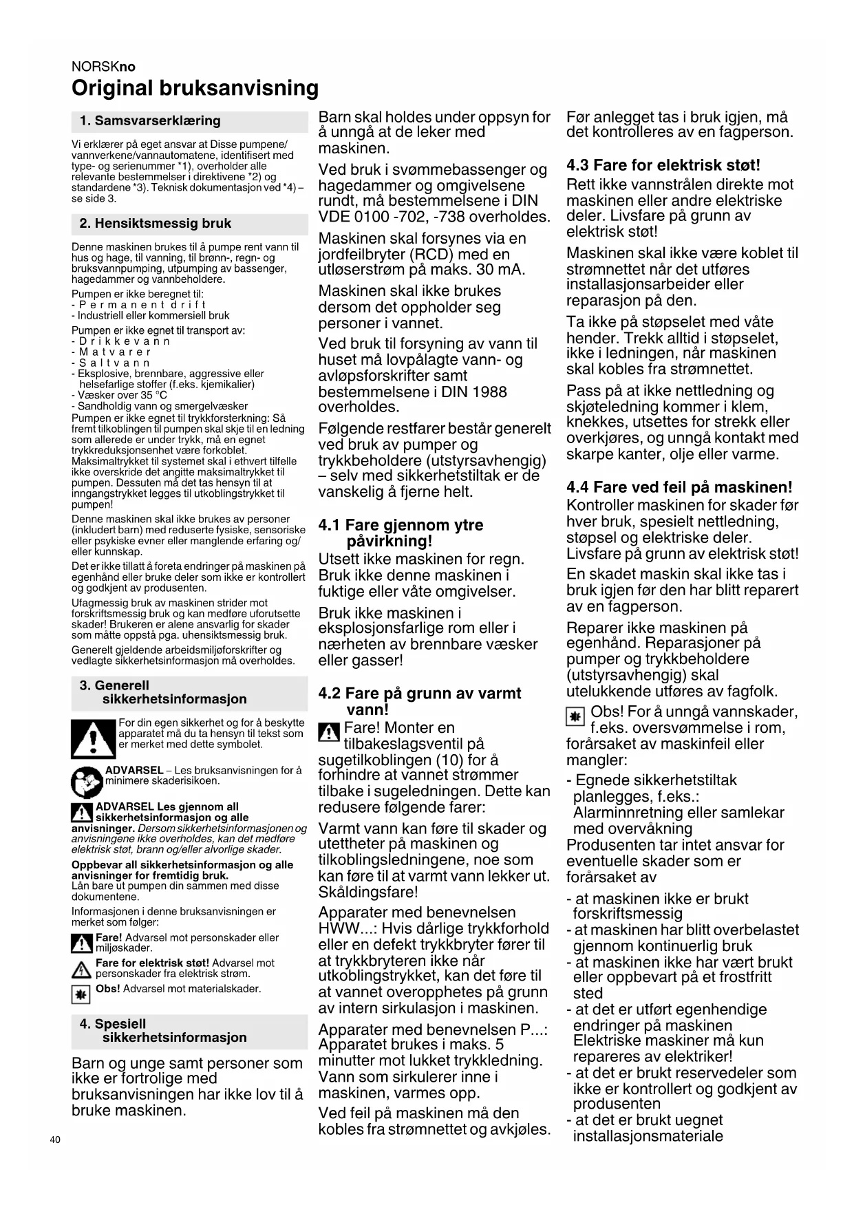 Original bruksanvisning Vi erklærer på eget ansvar at Disse pumpene/ vannverkene/vannautomatene, identifisert med type- og serienummer *1), overholder alle relevante bestemmelser i direktivene *2) og standardene *3). Teknisk dokumentasjon ved *4) – se side 3. Denne maskinen brukes til å pumpe rent vann til hus og hage, til vanning, til brønn-, regn- og bruksvannpumping, utpumping av bassenger, hagedammer og vannbeholdere. Pumpen er ikke beregnet til: -Permanent drift - Industriell eller kommersiell bruk Pumpen er ikke egnet til transport av: -Drikkevann -Matvarer -Saltvann - Eksplosive, brennbare, aggressive eller helsefarlige stoffer (f.eks. kjemikalier) - Væsker over 35 °C - Sandholdig vann og smergelvæsker Pumpen er ikke egnet til trykkforsterkning: Så fremt tilkoblingen til pumpen skal skje til en ledning som allerede er under trykk, må en egnet trykkreduksjonsenhet være forkoblet. Maksimaltrykket til systemet skal i ethvert tilfelle ikke overskride det angitte maksimaltrykket til pumpen. Dessuten må det tas hensyn til at inngangstrykket legges til utkoblingstrykket til pumpen! Denne maskinen skal ikke brukes av personer (inkludert barn) med reduserte fysiske, sensoriske eller psykiske evner eller manglende erfaring og/ eller kunnskap. Det er ikke tillatt å foreta endringer på maskinen på egenhånd eller bruke deler som ikke er kontrollert og godkjent av produsenten. Ufagmessig bruk av maskinen strider mot forskriftsmessig bruk og kan medføre uforutsette skader! Brukeren er alene ansvarlig for skader som måtte oppstå pga. uhensiktsmessig bruk. Generelt gjeldende arbeidsmiljøforskrifter og vedlagte sikkerhetsinformasjon må overholdes. For din egen sikkerhet og for å beskytte apparatet må du ta hensyn til tekst som er merket med dette symbolet. ADVARSEL – Les bruksanvisningen for å minimere skaderisikoen. ADVARSEL Les gjennom all sikkerhetsinformasjon og alle anvisninger. Dersom sikkerhetsinformasjonen og anvisningene ikke overholdes, kan det medføre elektrisk støt, brann og/eller alvorlige skader. Oppbevar all sikkerhetsinformasjon og alle anvisninger for fremtidig bruk. Lån bare ut pumpen din sammen med disse dokumentene. Informasjonen i denne bruksanvisningen er merket som følger: Fare! Advarsel mot personskader eller miljøskader. Fare for elektrisk støt! Advarsel mot personskader fra elektrisk strøm. Obs! Advarsel mot materialskader. Barn og unge samt personer som ikke er fortrolige med bruksanvisningen har ikke lov til å bruke maskinen. Barn skal holdes under oppsyn for å unngå at de leker med maskinen. Ved bruk i svømmebassenger og hagedammer og omgivelsene rundt, må bestemmelsene i DIN VDE 0100 -702, -738 overholdes. Maskinen skal forsynes via en jordfeilbryter (RCD) med en utløserstrøm på maks. 30 mA. Maskinen skal ikke brukes dersom det oppholder seg personer i vannet. Ved bruk til forsyning av vann til huset må lovpålagte vann- og avløpsforskrifter samt bestemmelsene i DIN 1988 overholdes. Følgende restfarer består generelt ved bruk av pumper og trykkbeholdere (utstyrsavhengig) – selv med sikkerhetstiltak er de vanskelig å fjerne helt.