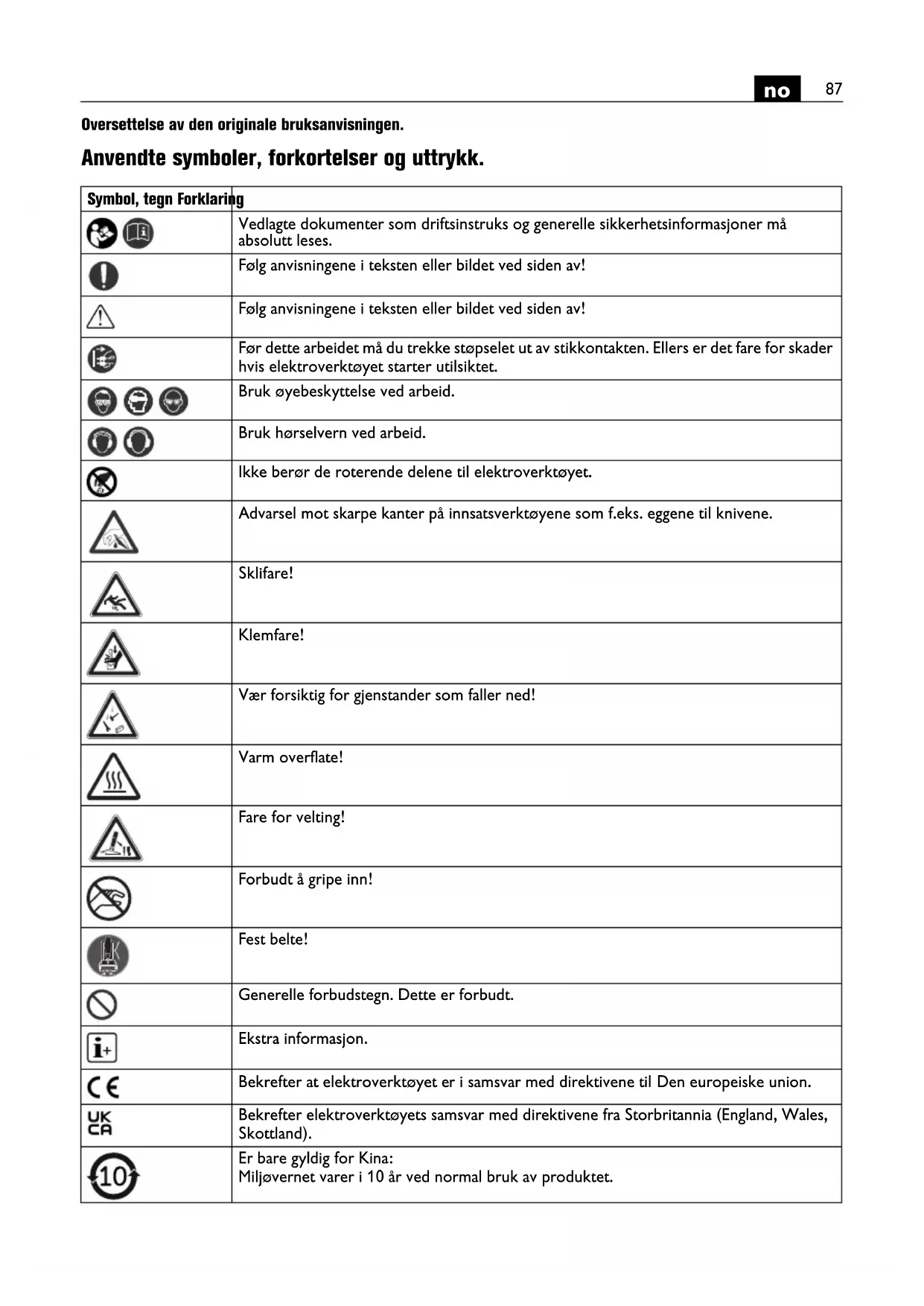 Oversettelse av den originale bruksanvisningen. Anvendte symboler, forkortelser og uttrykk. Symbol, tegn Forklaring Vedlagte dokumenter som driftsinstruks og generelle sikkerhetsinformasjoner må absolutt leses. Følg anvisningene i teksten eller bildet ved siden av! Følg anvisningene i teksten eller bildet ved siden av! Før dette arbeidet må du trekke støpselet ut av stikkontakten. Ellers er det fare for skader hvis elektroverktøyet starter utilsiktet. Bruk øyebeskyttelse ved arbeid. Bruk hørselvern ved arbeid. Ikke berør de roterende delene til elektroverktøyet. Advarsel mot skarpe kanter på innsatsverktøyene som f.eks. eggene til knivene. Sklifare! Klemfare! Vær forsiktig for gjenstander som faller ned! Varm overflate! Fare for velting! Forbudt å gripe inn! Fest belte! Generelle forbudstegn. Dette er forbudt. Ekstra informasjon. Bekrefter at elektroverktøyet er i samsvar med direktivene til Den europeiske union. Bekrefter elektroverktøyets samsvar med direktivene fra Storbritannia (England, Wales, Skottland). Er bare gyldig for Kina: Miljøvernet varer i 10 år ved normal bruk av produktet.88