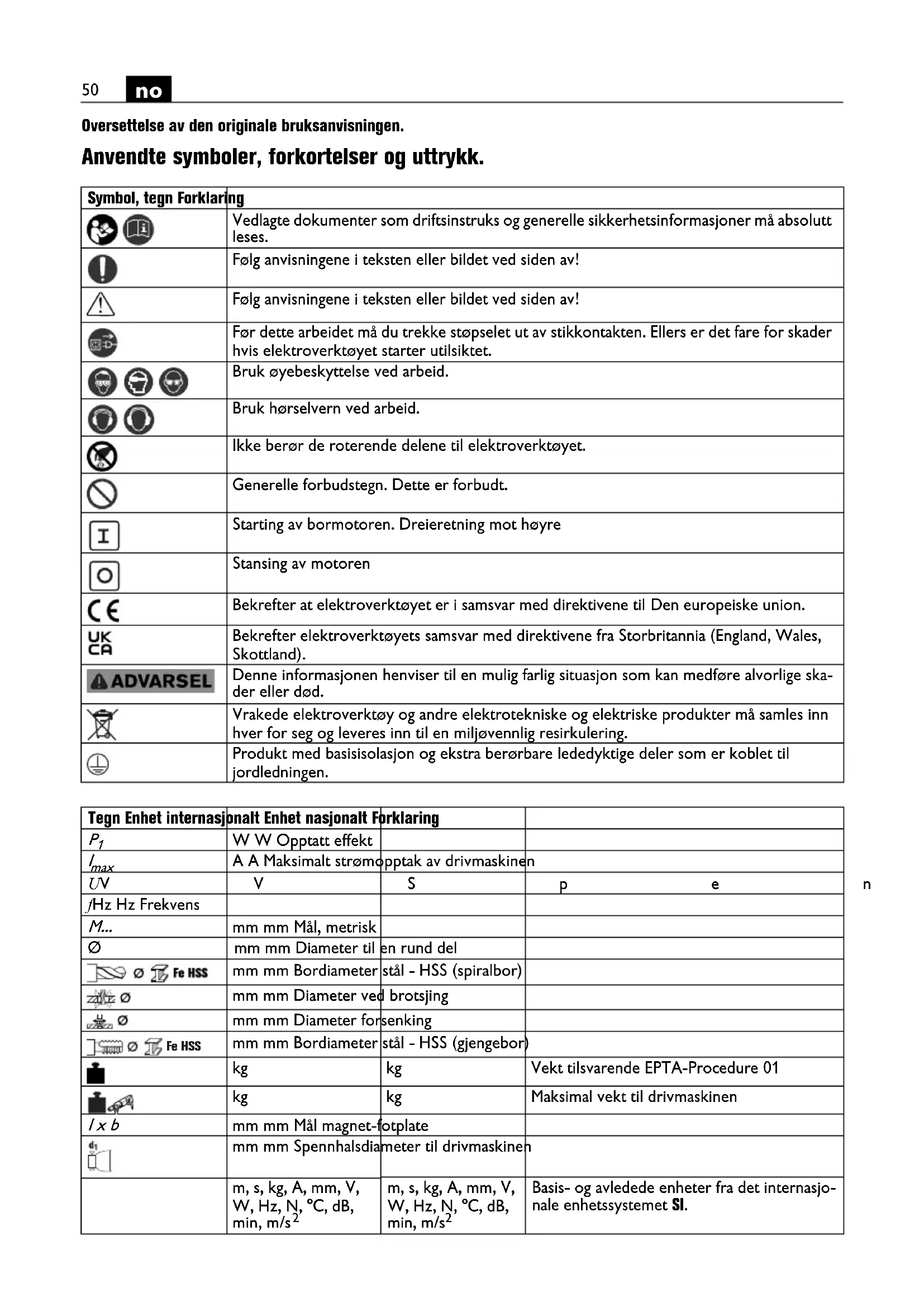 Oversettelse av den originale bruksanvisningen. Anvendte symboler, forkortelser og uttrykk. Symbol, tegn Forklaring Vedlagte dokumenter som driftsinstruks og generelle sikkerhetsinformasjoner må absolutt leses. Følg anvisningene i teksten eller bildet ved siden av! Følg anvisningene i teksten eller bildet ved siden av! Før dette arbeidet må du trekke støpselet ut av stikkontakten. Ellers er det fare for skader hvis elektroverktøyet starter utilsiktet. Bruk øyebeskyttelse ved arbeid. Bruk hørselvern ved arbeid. Ikke berør de roterende delene til elektroverktøyet. Generelle forbudstegn. Dette er forbudt. Starting av bormotoren. Dreieretning mot høyre Stansing av motoren Bekrefter at elektroverktøyet er i samsvar med direktivene til Den europeiske union. Bekrefter elektroverktøyets samsvar med direktivene fra Storbritannia (England, Wales, Skottland). Denne informasjonen henviser til en mulig farlig situasjon som kan medføre alvorlige ska- der eller død. Vrakede elektroverktøy og andre elektrotekniske og elektriske produkter må samles inn hver for seg og leveres inn til en miljøvennlig resirkulering. Produkt med basisisolasjon og ekstra berørbare lededyktige deler som er koblet til jordledningen. Tegn Enhet internasjonalt Enhet nasjonalt Forklaring