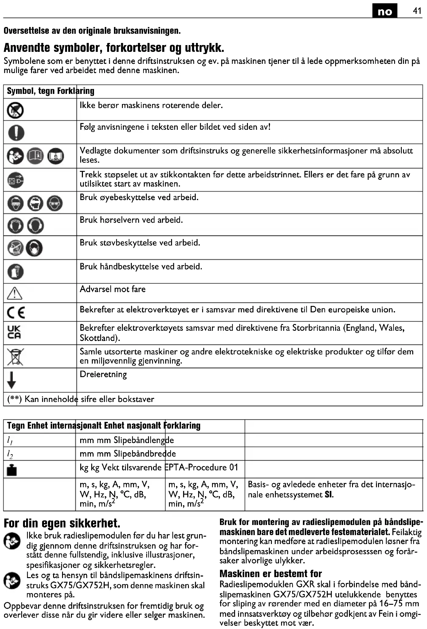 Radieslipemoduklen GXR skal i forbindelse med bandslipemaskinen GX75/GX752H utelukkende benyttes for sliping av rorer med en diameter pa 16-75 mm med innsatsverktoy og tilbehor godkjent av Fein i omgivelser beskyttet mot vær.