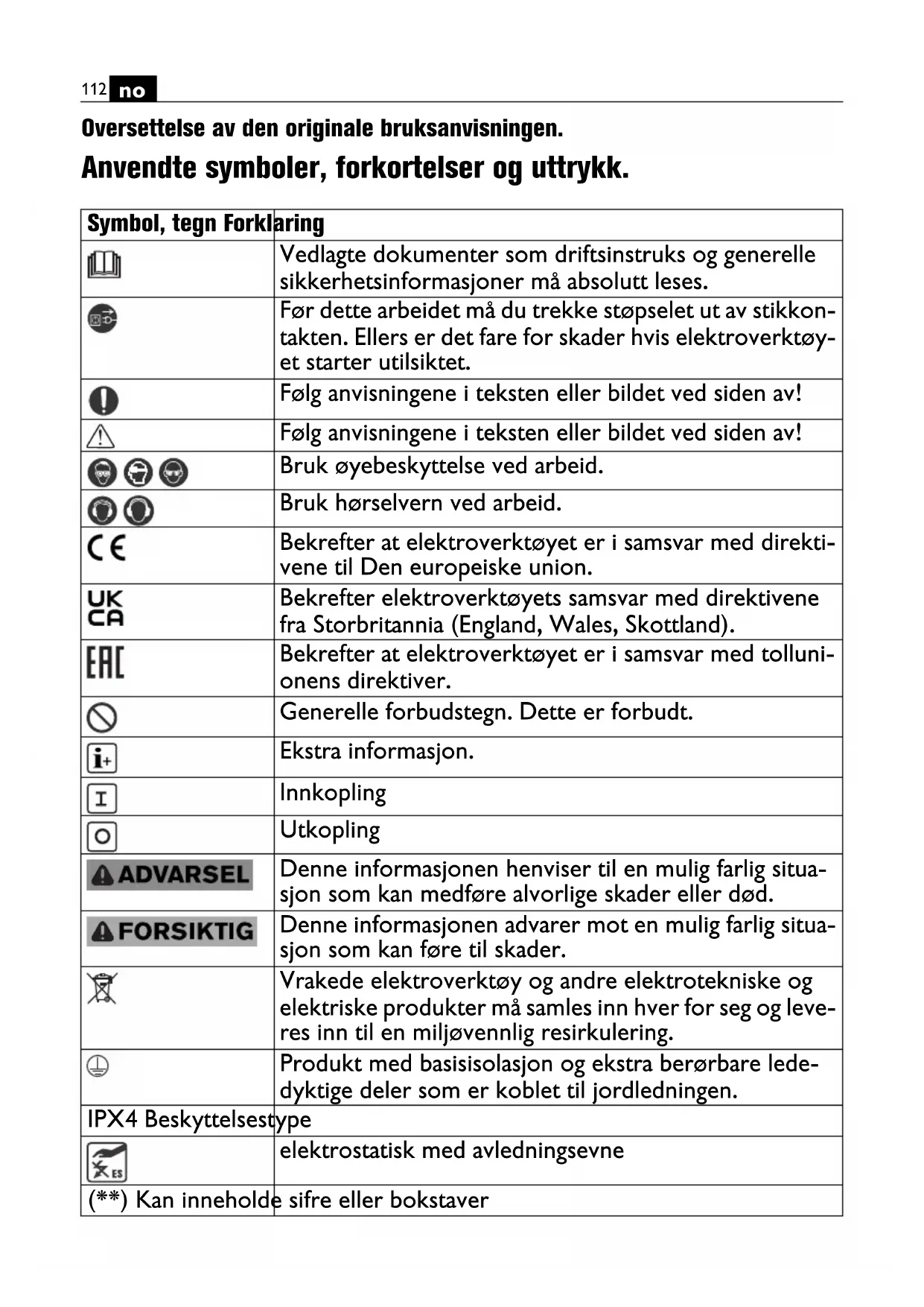Oversettelse av den originale bruksanvisningen. Anvendte symboler, forkortelser og uttrykk. Symbol, tegn Forklaring Vedlagte dokumenter som driftsinstruks og generelle sikkerhetsinformasjoner må absolutt leses. Før dette arbeidet må du trekke støpselet ut av stikkon- takten. Ellers er det fare for skader hvis elektroverktøy- et starter utilsiktet. Følg anvisningene i teksten eller bildet ved siden av! Følg anvisningene i teksten eller bildet ved siden av! Bruk øyebeskyttelse ved arbeid. Bruk hørselvern ved arbeid. Bekrefter at elektroverktøyet er i samsvar med direkti- vene til Den europeiske union. Bekrefter elektroverktøyets samsvar med direktivene fra Storbritannia (England, Wales, Skottland). Bekrefter at elektroverktøyet er i samsvar med tolluni- onens direktiver. Generelle forbudstegn. Dette er forbudt. Ekstra informasjon. Innkopling Utkopling Denne informasjonen henviser til en mulig farlig situa- sjon som kan medføre alvorlige skader eller død. Denne informasjonen advarer mot en mulig farlig situa- sjon som kan føre til skader. Vrakede elektroverktøy og andre elektrotekniske og elektriske produkter må samles inn hver for seg og leve- res inn til en miljøvennlig resirkulering. Produkt med basisisolasjon og ekstra berørbare lede- dyktige deler som er koblet til jordledningen. IPX4 Beskyttelsestype elektrostatisk med avledningsevne (**) Kan inneholde sifre eller bokstaver113