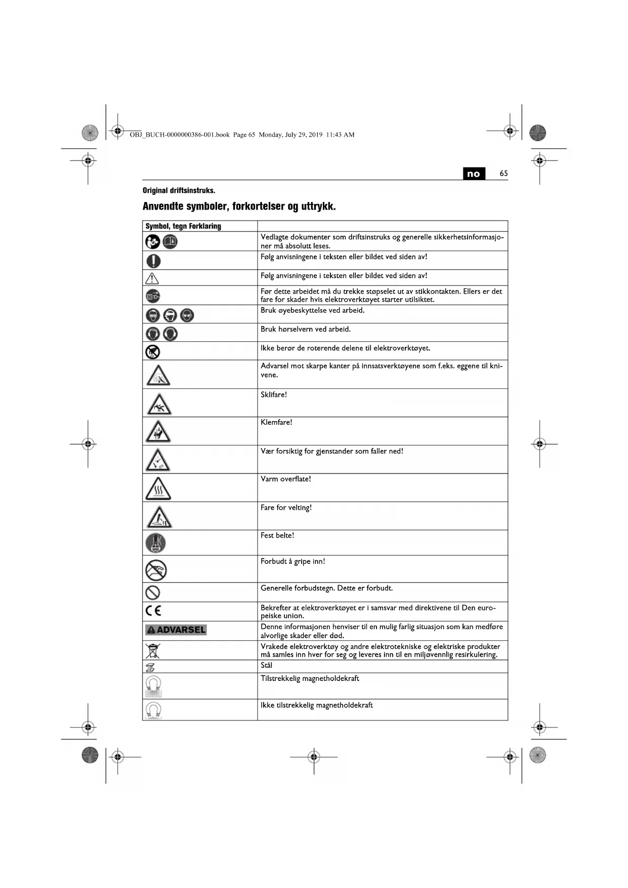 Original driftsinstruks. Anvendte symboler, forkortelser og uttrykk. Symbol, tegn Forklaring Vedlagte dokumenter som driftsinstruks og generelle sikkerhetsinformasjo- ner må absolutt leses. Følg anvisningene i teksten eller bildet ved siden av! Følg anvisningene i teksten eller bildet ved siden av! Før dette arbeidet må du trekke støpselet ut av stikkontakten. Ellers er det fare for skader hvis elektroverktøyet starter utilsiktet. Bruk øyebeskyttelse ved arbeid. Bruk hørselvern ved arbeid. Ikke berør de roterende delene til elektroverktøyet. Advarsel mot skarpe kanter på innsatsverktøyene som f.eks. eggene til kni- vene. Sklifare! Klemfare! Vær forsiktig for gjenstander som faller ned! Varm overflate! Fare for velting! Fest belte! Forbudt å gripe inn! Generelle forbudstegn. Dette er forbudt. Bekrefter at elektroverktøyet er i samsvar med direktivene til Den euro- peiske union. Denne informasjonen henviser til en mulig farlig situasjon som kan medføre alvorlige skader eller død. Vrakede elektroverktøy og andre elektrotekniske og elektriske produkter må samles inn hver for seg og leveres inn til en miljøvennlig resirkulering. Stål Tilstrekkelig magnetholdekraft Ikke tilstrekkelig magnetholdekraft OBJ_BUCH-0000000386-001.book Page 65 Monday, July 29, 2019 11:43 AM66