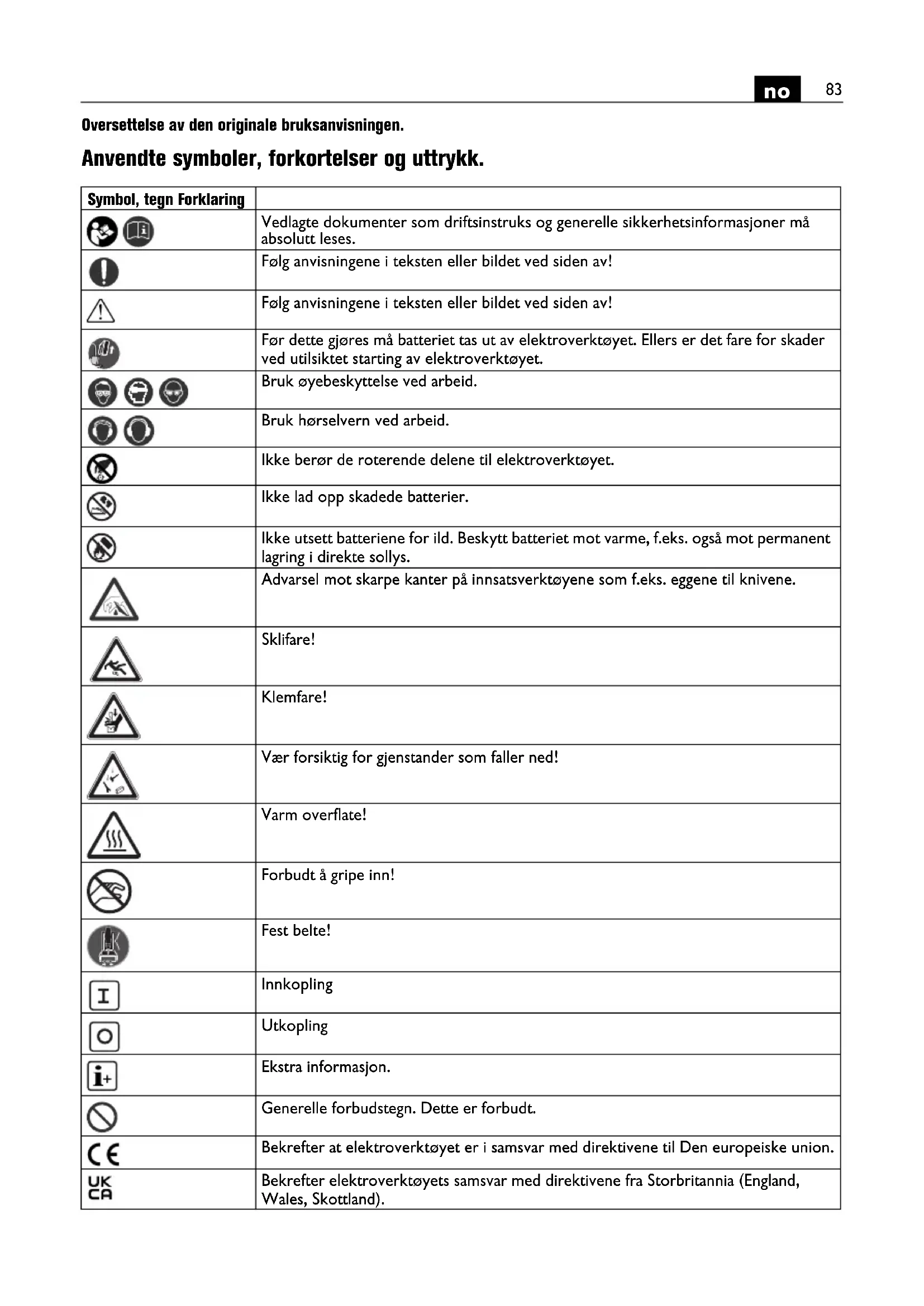 Oversettelse av den originale bruksanvisningen. Anvendte symboler, forkortelser og uttrykk. Symbol, tegn Forklaring Vedlagte dokumenter som driftsinstruks og generelle sikkerhetsinformasjoner må absolutt leses. Følg anvisningene i teksten eller bildet ved siden av! Følg anvisningene i teksten eller bildet ved siden av! Før dette gjøres må batteriet tas ut av elektroverktøyet. Ellers er det fare for skader ved utilsiktet starting av elektroverktøyet. Bruk øyebeskyttelse ved arbeid. Bruk hørselvern ved arbeid. Ikke berør de roterende delene til elektroverktøyet. Ikke lad opp skadede batterier. Ikke utsett batteriene for ild. Beskytt batteriet mot varme, f.eks. også mot permanent lagring i direkte sollys. Advarsel mot skarpe kanter på innsatsverktøyene som f.eks. eggene til knivene. Sklifare! Klemfare! Vær forsiktig for gjenstander som faller ned! Varm overflate! Forbudt å gripe inn! Fest belte! Innkopling Utkopling Ekstra informasjon. Generelle forbudstegn. Dette er forbudt. Bekrefter at elektroverktøyet er i samsvar med direktivene til Den europeiske union. Bekrefter elektroverktøyets samsvar med direktivene fra Storbritannia (England, Wales, Skottland).84