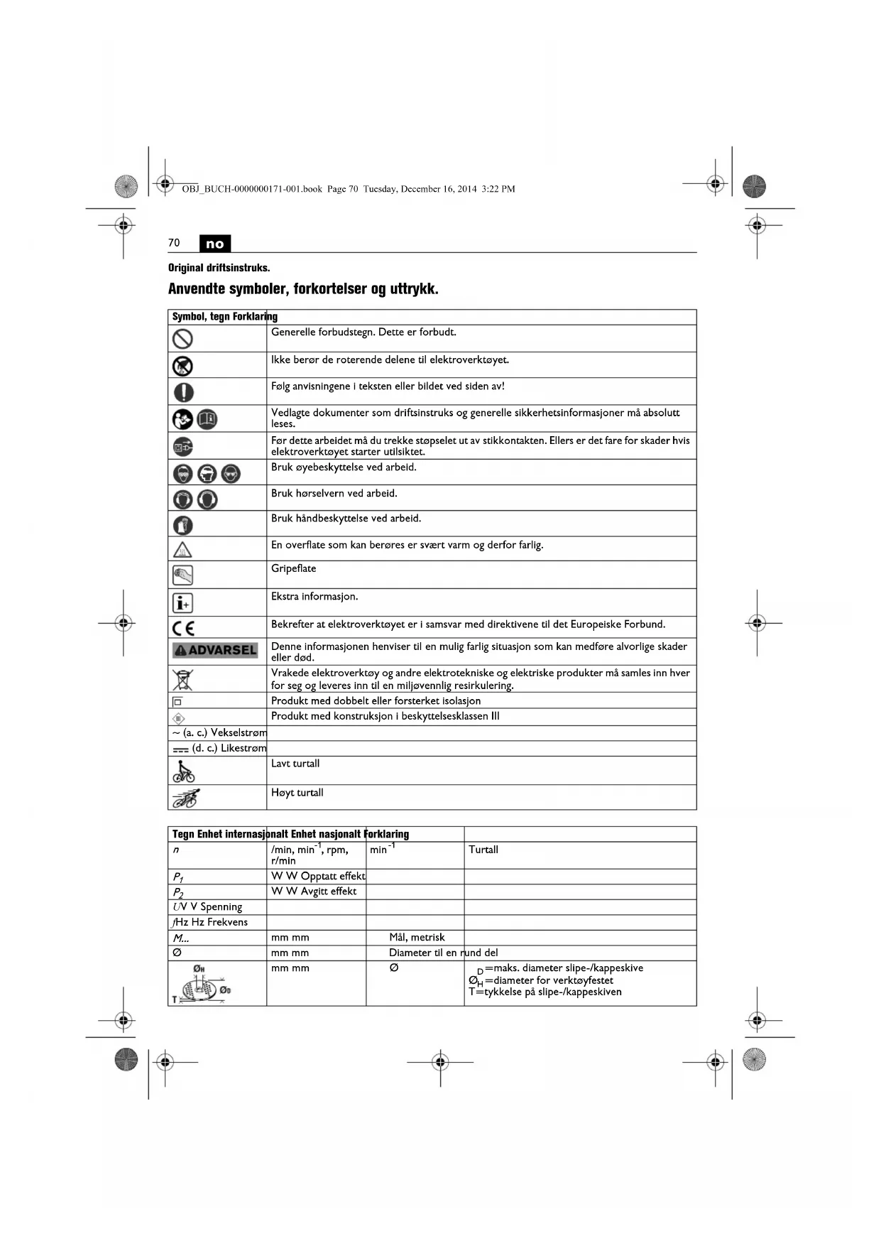 Original driftsinstruks. Anvendte symboler, forkortelser og uttrykk. Symbol, tegn Forklaring Generelle forbudstegn. Dette er forbudt. Ikke berør de roterende delene til elektroverktøyet. Følg anvisningene i teksten eller bildet ved siden av! Vedlagte dokumenter som driftsinstruks og generelle sikkerhetsinformasjoner må absolutt leses. Før dette arbeidet må du trekke støpselet ut av stikkontakten. Ellers er det fare for skader hvis elektroverktøyet starter utilsiktet. Bruk øyebeskyttelse ved arbeid. Bruk hørselvern ved arbeid. Bruk håndbeskyttelse ved arbeid. En overflate som kan berøres er svært varm og derfor farlig. Gripeflate Ekstra informasjon. Bekrefter at elektroverktøyet er i samsvar med direktivene til det Europeiske Forbund. Denne informasjonen henviser til en mulig farlig situasjon som kan medføre alvorlige skader eller død. Vrakede elektroverktøy og andre elektrotekniske og elektriske produkter må samles inn hver for seg og leveres inn til en miljøvennlig resirkulering. Produkt med dobbelt eller forsterket isolasjon Produkt med konstruksjon i beskyttelsesklassen III ~ (a. c.) Vekselstrøm (d. c.) Likestrøm Lavt turtall Høyt turtall Tegn Enhet internasjonalt Enhet nasjonalt Forklaring
