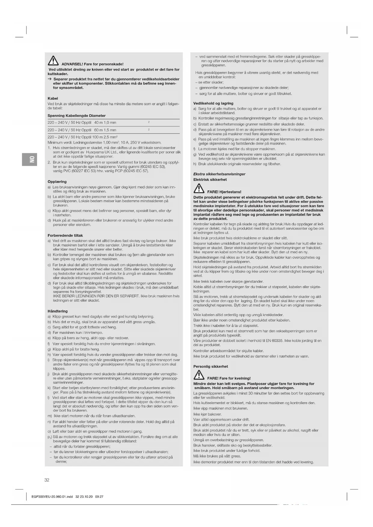 ) Slå av motoren og trekk støpselet ut av stikkontakten. Forsikre deg om at alle bevegelige deler har kommet til fullstendig stillstand: – alltid når du forlater gressklipperen; – før du løsner blokkeringene eller utbedrer forstoppelser i utkastkanalen; – før du kontrollerer eller rengjør gressklipperen eller før du utfører arbeid på denne; – ved sammenstøt med et fremmedlegeme. Søk etter skader på gressklippe- ren og utfør nødvendige reparasjoner før du starter på nytt og arbeider med gressklipperen. Hvis gressklipperen begynner å vibrere uvanlig sterkt, er det nødvendig med en umiddelbar kontroll: – se etter skader; – gjennomfør nødvendige reparasjoner av skadede deler; – sørg for at alle muttere, bolter og skruer er godt tiltrukket. Vedlikehold og lagring a) Sørg for at alle muttere, bolter og skruer er godt til trukket og at apparatet er isikker arbeidstilstand. b) Kontroller regelmessig gressfanginnretningen for slitasje eller tap av funksjon. c) Erstatt av sikkerhetsmessige grunner nedslitte eller skadede deler. d) Pass på at bevegelsen til en av skjæreknivene kan føre til rotasjon av de andre skjæreknivene på maskiner med flere skjærekniver. e) Pass på ved innstilling av maskinen at ingen fingre klemmes inn mellom beve- gelige skjærekniver og faststående deler på maskinen. f) La motoren kjøles ned før du stopper maskinen. g) Ved vedlikehold av skjæreknivene være oppmerksom på at skjæreknivene kan bevege seg selv når spenningskilden er utkoblet. h) Bruk utelukkende originale reservedeler og tilbehør. Ekstra sikkerhetsanvisninger Elektrisk sikkerhet FARE! Hjertestans! Dette produktet genererer et elektromagnetisk felt under drift. Dette fel- tet kan under visse betingelser påvirke funksjonen til aktive eller passive medisinske implantater. For å utelukke fare ved situasjoner som kan føre til alvorlige eller dødelige personskader, skal personer med et medisinsk implantat rådføre seg med lege og produsenten av implantatet før bruk av dette produktet. Kontroller kabelen for tegn på skade og aldring før bruk.Hvis du oppdager at led- ningen er defekt, må du ta produktet med til et autorisert servicesenter og be om at ledningen byttes ut. Ikke bruk produktet hvis elektrokablene er skadet eller slitt. Separer kabelen umiddelbart fra strømforsyningen hvis kabelen har kutt eller iso- leringen er skadet. Berør elektrokabelen først når strømforsyningen er frakoblet. Ikke reparer en kabel som har kutt eller skader. Bytt den ut med en ny. Skjøteledningen må vikles av for bruk. Oppviklede kabler kan overopphetes og redusere effekten til gressklipperen. Hold skjøteledningen på avstand fra produktet. Arbeid alltid bort fra strømkilden ved at du klipper frem og tilbake og ikke under noen omstendighet beveger deg i sirkel. Ikke trekk kabelen over skarpe gjenstander. Koble alltid ut strømforsyningen før du trekker ut støpselet, kabelen eller skjøte- ledningen. Slå av motoren, trekk ut strømstøpselet og undersøk kabelen for skader og ald- ring før du vikler den opp for lagring. En skadet kabel skal ikke under noen omstendighet repareres. Bytt den ut med en ny. Bruk kun en original reserveka- bel. Vikle kabelen alltid ordentlig opp og unngå knekksteder. Bær ikke under noen omstendighet produktet etter kabelen. Trekk ikke i kabelen for å ta ut støpselet. Bruk produktet kun med et strømnett som har den vekselspenningen som er angitt på produktets typeskilt. Våre produkter er dobbelt isolert i henhold til EN 60335. Ikke koble jording til en del av produktet. Kontroller arbeidsområdet for skjulte kabler. Ikke bruk produktet for vedlikehold av dammer eller i nærheten av vann. Personlig sikkerhet FARE! Fare for kvelning! Mindre deler kan lett svelges. Plastposer utgjør fare for kvelning for småbarn. Hold småbarn på avstand under monteringen. La gressklipperen avkjøles i minst 30 minutter før den settes bort for oppbevaring eller før vedlikehold. Hvis kutteelementet er blokkert, må du stanse maskinen og kontrollere den. Ikke vipp maskinen mot brukeren. Ikke kjør bakover. Vær alltid oppmerksom under drift. Bruk aldri produktet på steder der det er eksplosjonsfare. Bruk aldri produktet når du er trett, syk eller er påvirket av alkohol, rusgift eller medisin eller hvis du er sliten. Unngå en overbelastning av gressklipperen. Bruk hansker, sklifaste sko og beskyttelsesbriller. Ikke bruk produktet under fuktige forhold. Må ikke brukes på vått gress. Ikke demonter produktet mer enn til den tilstanden det hadde ved levering. EGP300VEU-20.960.01.indd 32 23.10.20 09:27NO