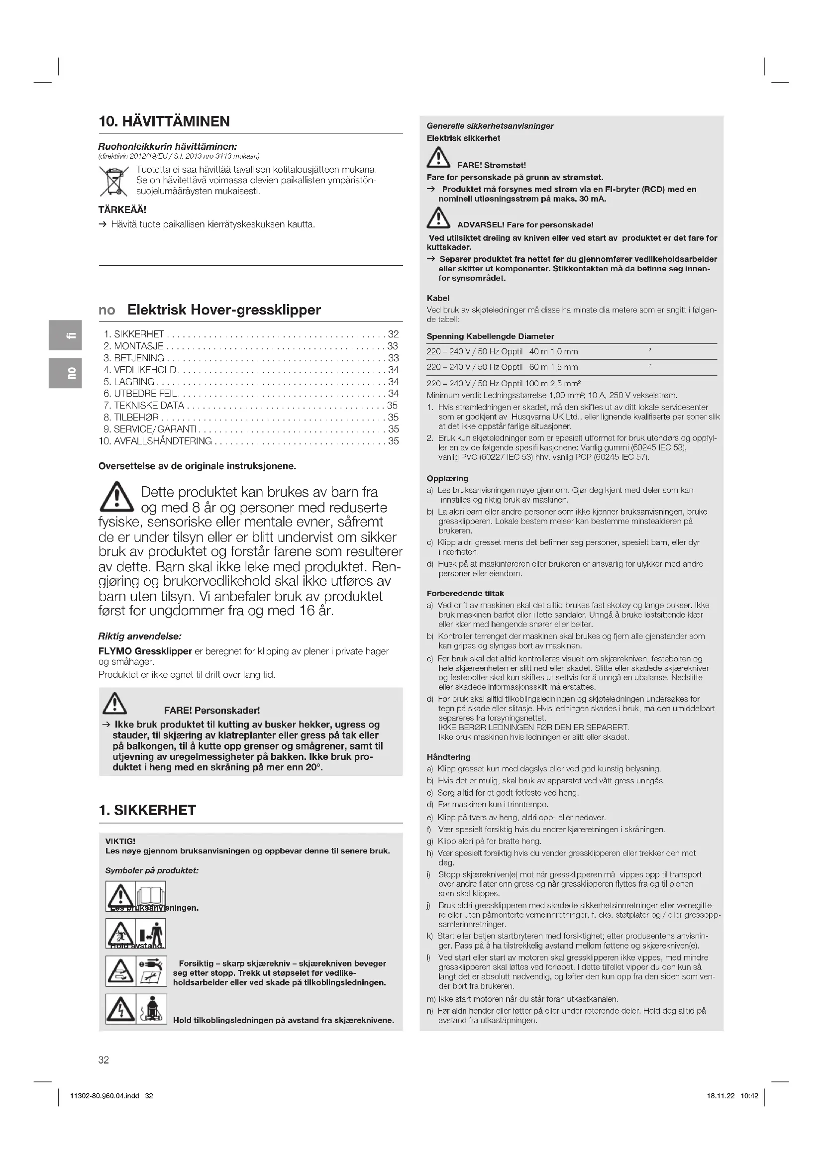 Oversettelse av de originale instruksjonene. Dette produktet kan brukes av barn fra ogmed 8 år og personer med reduserte fysiske, sensoriske eller mentale evner, såfremt deer under tilsyn eller er blitt undervist om sikker bruk av produktet og forstår farene som resulterer av dette. Barn skal ikke leke med produktet. Ren- gjøring og brukervedlikehold skal ikke utføres av barn uten tilsyn. Vi anbefaler bruk av produktet først for ungdommer fra og med 16 år. Riktig anvendelse: FLYMO Gressklipper er beregnet for klipping av plener i private hager og småhager. Produktet er ikke egnet til drift over lang tid. FARE! Personskader! v Ikke bruk produktet til kutting av busker hekker, ugress og stauder, til skjæring av klatreplanter eller gress på tak eller på balkongen, til å kutte opp grenser og smågrener, samt til utjevning av uregelmessigheter på bakken. Ikke bruk pro- dukteti heng med en skråning på mer enn 20°. VIKTIG! Les nøye gjennom bruksanvisningen og oppbevar denne til senere bruk. Symboler på produktet: Les bruksanvisningen. Hold avstand. Forsiktig – skarp skjærekniv – skjærekniven beveger seg etter stopp. Trekk ut støpselet før vedlike- holdsarbeider eller ved skade på tilkoblingsledningen.