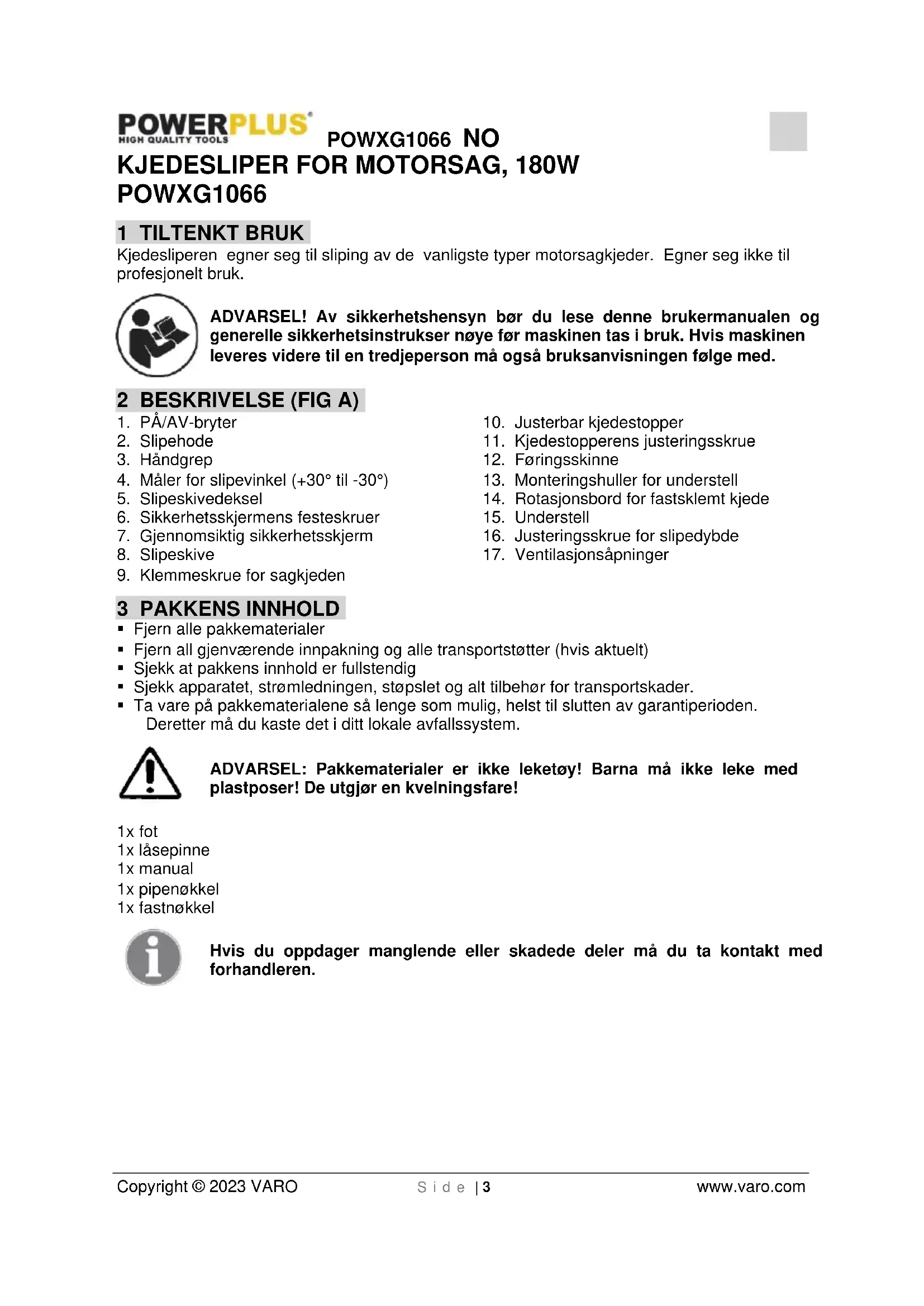- Denne maskinen oppfyller kravene til gjeldende sikkerhetsforskrifter. Alt vedlikehold som ikke dekkes i denne håndboken, kan kun utføres på et serviceverksted. Det må kun brukes originale reservedeler. Hvis ikke kan det føre til farer.POWXG1066 NO Copyright © 2023 VARO S i d e | 6 www.varo.com