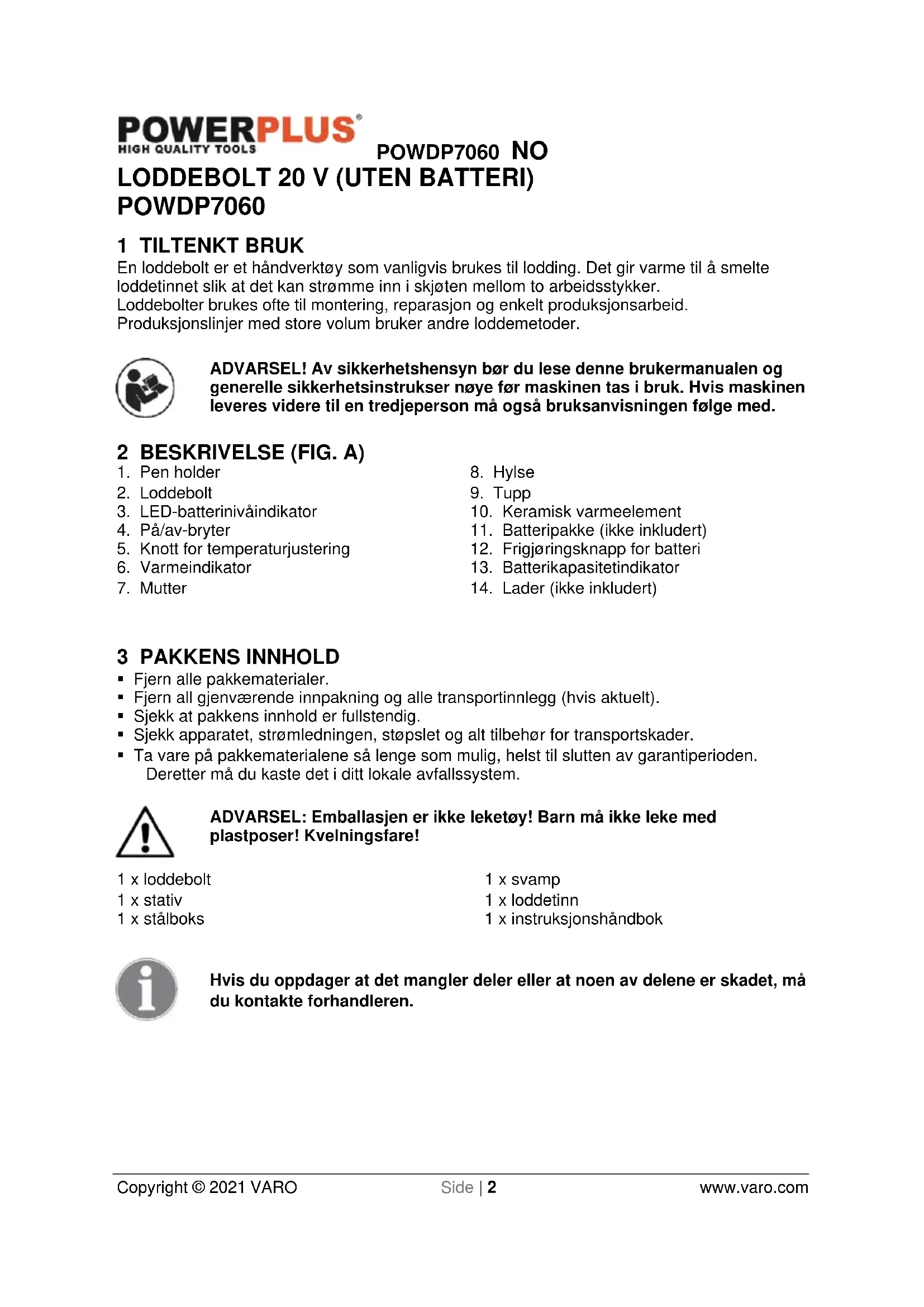 Copyright © 2021 VARO Side | 2 www.varo.com LODDEBOLT 20 V (UTEN BATTERI) POWDP7060 1 TILTENKT BRUK En loddebolt er et håndverktøy som vanligvis brukes til lodding. Det gir varme til å smelte loddetinnet slik at det kan strømme inn i skjøten mellom to arbeidsstykker. Loddebolter brukes ofte til montering, reparasjon og enkelt produksjonsarbeid. Produksjonslinjer med store volum bruker andre loddemetoder. ADVARSEL! Av sikkerhetshensyn bør du lese denne brukermanualen og generelle sikkerhetsinstrukser nøye før maskinen tas i bruk. Hvis maskinen leveres videre til en tredjeperson må også bruksanvisningen følge med. 2 BESKRIVELSE (FIG. A)