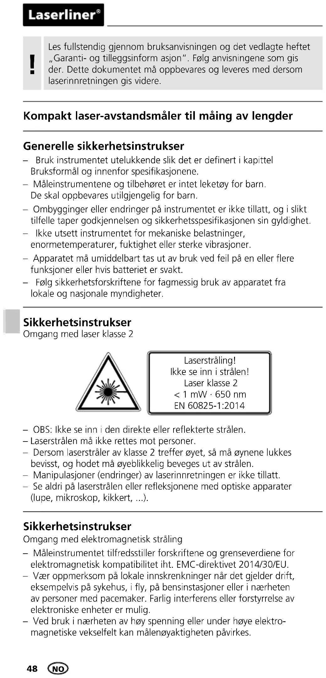 Generelle sikkerhetsinstrukser – Bruk instrumentet utelukkende slik det er denert i kapittel Bruksformål og innenfor spesikasjonene. – Måleinstrumentene og tilbehøret er intet leketøy for barn. De skal oppbevares utilgjengelig for barn. – Ombygginger eller endringer på instrumentet er ikke tillatt, og i slikt tilfelle taper godkjennelsen og sikkerhetsspesikasjonen sin gyldighet. – Ikke utsett instrumentet for mekaniske belastninger, enormetemperaturer, fuktighet eller sterke vibrasjoner. – Apparatet må umiddelbart tas ut av bruk ved feil på en eller ere funksjoner eller hvis batteriet er svakt. – Følg sikkerhetsforskriftene for fagmessig bruk av apparatet fra lokale og nasjonale myndigheter. – OBS: Ikke se inn i den direkte eller reekterte strålen. – Laserstrålen må ikke rettes mot personer. – Dersom laserstråler av klasse 2 treffer øyet, så må øynene lukkes bevisst, og hodet må øyeblikkelig beveges ut av strålen. – Manipulasjoner (endringer) av laserinnretningen er ikke tillatt. – Se aldri på laserstrålen eller reeksjonene med optiske apparater (lupe, mikroskop, kikkert, ...). Sikkerhetsinstrukser Omgang med laser klasse 2 Laserstråling! Ikke se inn i strålen! Laser klasse 2 < 1 mW · 650 nm EN 60825-1:2014 Sikkerhetsinstrukser Omgang med elektromagnetisk stråling – Måleinstrumentet tilfredsstiller forskriftene og grenseverdiene for elektromagnetisk kompatibilitet iht. EMC-direktivet 2014/30/EU. – Vær oppmerksom på lokale innskrenkninger når det gjelder drift, eksempelvis på sykehus, i y, på bensinstasjoner eller i nærheten av personer med pacemaker. Farlig interferens eller forstyrrelse av elektroniske enheter er mulig. – Ved bruk i nærheten av høy spenning eller under høye elektro- magnetiske vekselfelt kan målenøyaktigheten påvirkes.LaserRange-Master T2