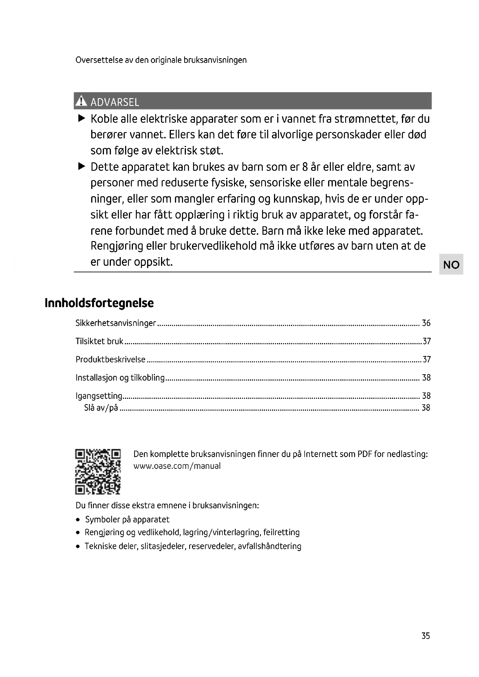 ADVARSEL Koble alle elektriske apparater som er i vannet fra strømnettet, før du berører vannet. Ellers kan det føre til alvorlige personskader eller død som følge av elektrisk støt. Dette apparatet kan brukes av barn som er 8 år eller eldre, samt av personer med reduserte fysiske, sensoriske eller mentale begrens- ninger, eller som mangler erfaring og kunnskap, hvis de er under opp- sikt eller har fått opplæring i riktig bruk av apparatet, og forstår fa- rene forbundet med å bruke dette. Barn må ikke leke med apparatet. Rengjøring eller brukervedlikehold må ikke utføres av barn uten at de er under oppsikt.