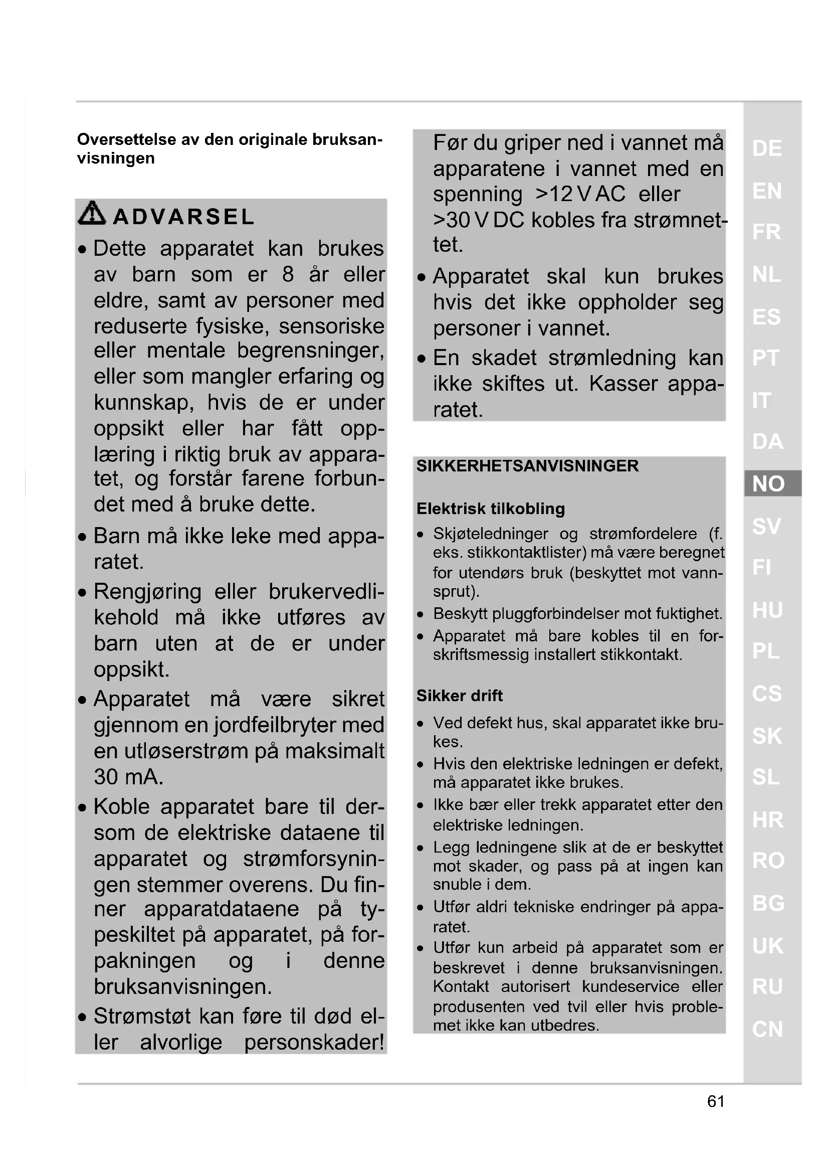 - Før du berører vannet må strømstøps- lene for alle apparater som befinner seg i vannet alltid trekkes ut. Slå på apparatet