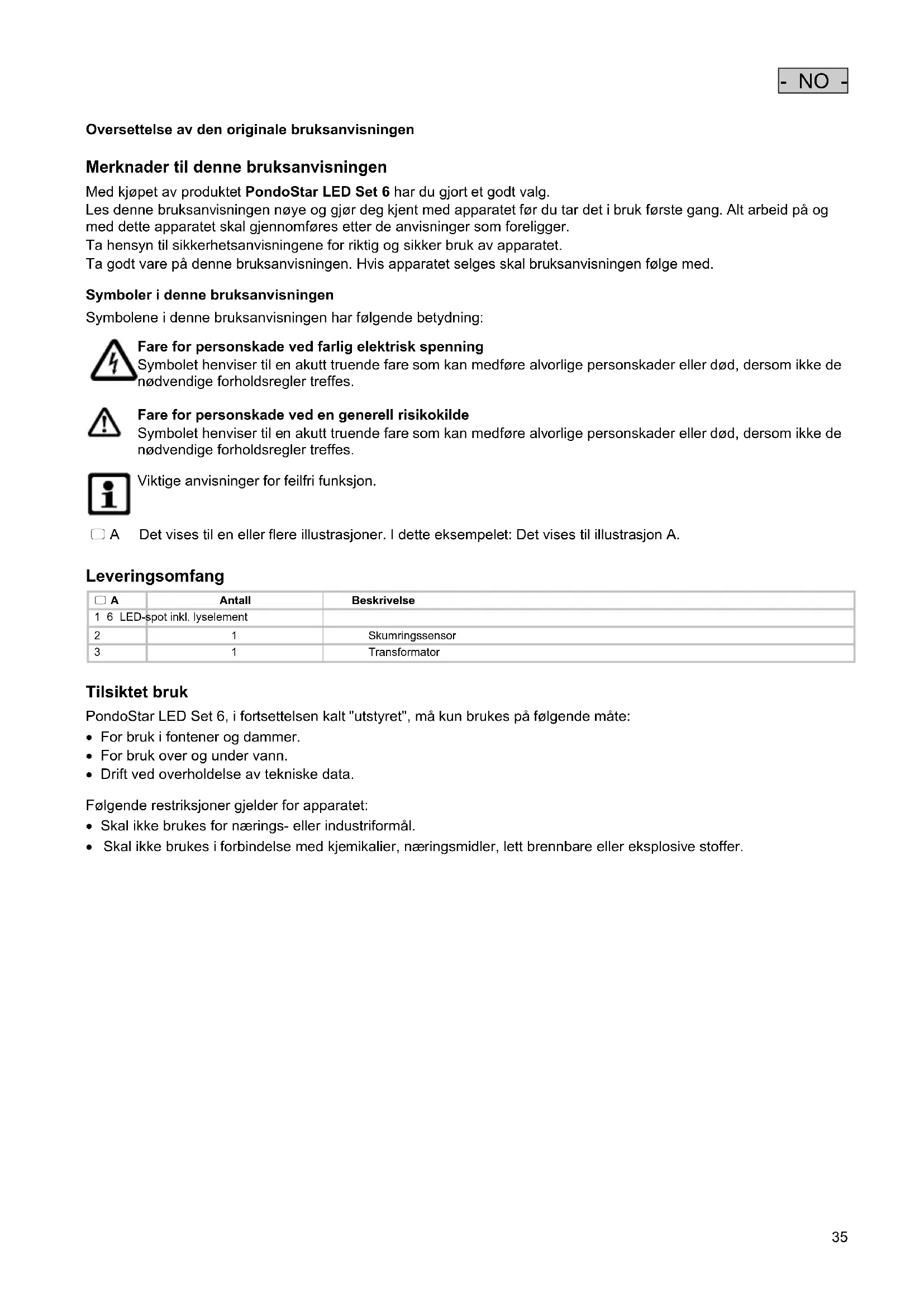 Merknader til denne bruksanvisningen Med kjøpet av produktet PondoStar LED Set 6 har du gjort et godt valg. Les denne bruksanvisningen nøye og gjør deg kjent med apparatet før du tar det i bruk første gang. Alt arbeid på og med dette apparatet skal gjennomføres etter de anvisninger som foreligger. Ta hensyn til sikkerhetsanvisningene for riktig og sikker bruk av apparatet. Ta godt vare på denne bruksanvisningen. Hvis apparatet selges skal bruksanvisningen følge med.