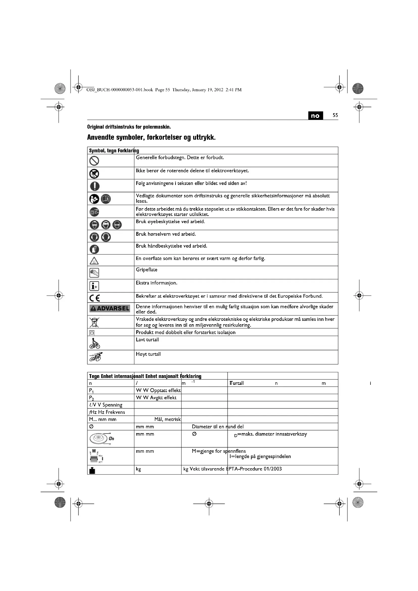 | m, s, kg, A, mm, V, W, Hz, N, °C, dB, min, m/s2 | m, s, kg, A, mm, V, W, Hz, N, °C, dB, min, m/s2 | Basis- og avledede enheter fra det internasjonale enchetssystemet S1. | |