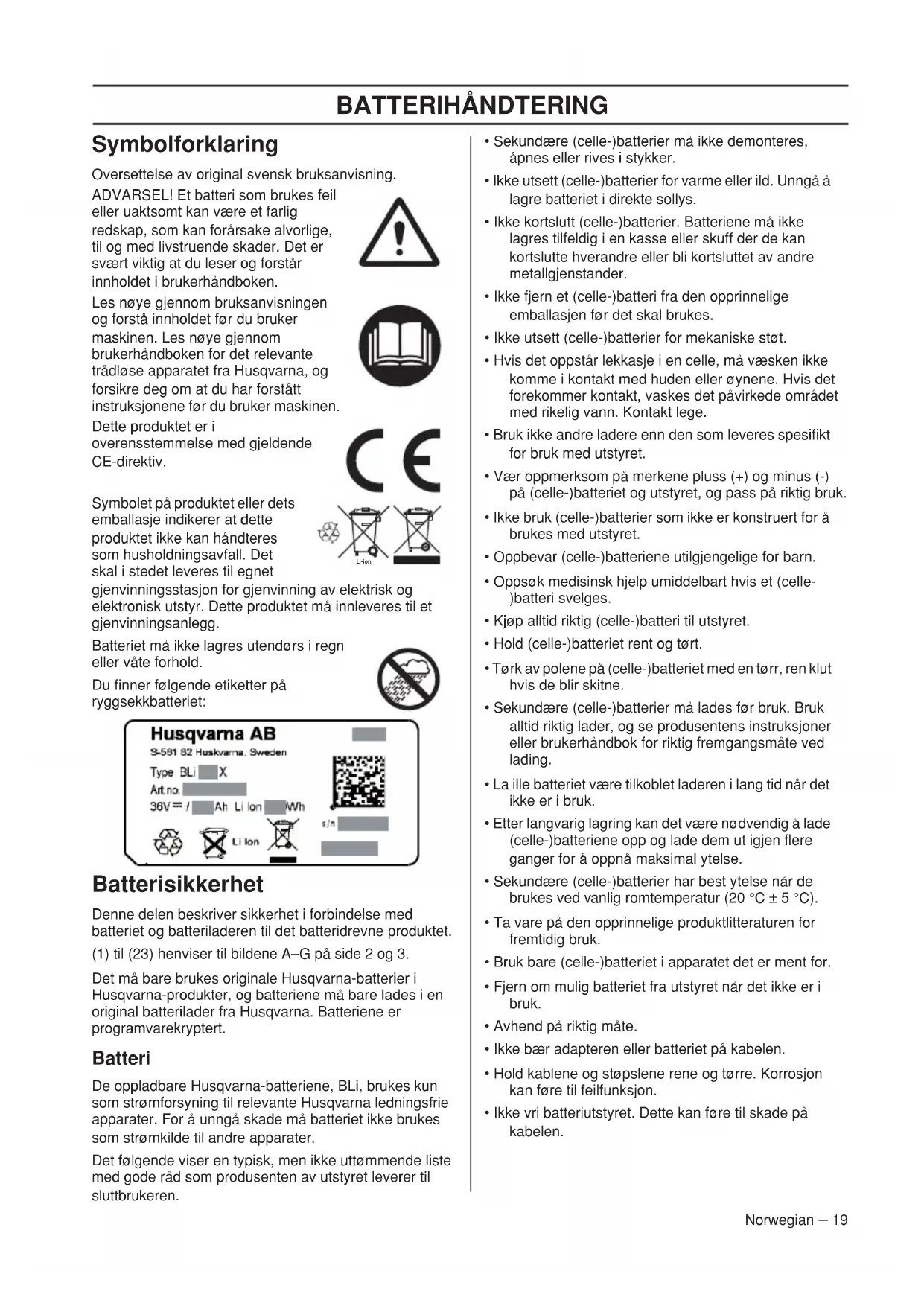 19BATTERIHÅNDTERING Norwegian – 19 Symbolforklaring Oversettelse av original svensk bruksanvisning. ADVARSEL! Et batteri som brukes feil eller uaktsomt kan være et farlig redskap, som kan forårsake alvorlige, til og med livstruende skader. Det er svært viktig at du leser og forstår innholdet i brukerhåndboken. Les nøye gjennom bruksanvisningen og forstå innholdet før du bruker maskinen. Les nøye gjennom brukerhåndboken for det relevante trådløse apparatet fra Husqvarna, og forsikre deg om at du har forstått instruksjonene før du bruker maskinen. Dette produktet er i overensstemmelse med gjeldende CE-direktiv. Symbolet på produktet eller dets emballasje indikerer at dette produktet ikke kan håndteres som husholdningsavfall. Det skal i stedet leveres til egnet gjenvinningsstasjon for gjenvinning av elektrisk og elektronisk utstyr. Dette produktet må innleveres til et gjenvinningsanlegg. Batteriet må ikke lagres utendørs i regn eller våte forhold. Du finner følgende etiketter på ryggsekkbatteriet: Batterisikkerhet Denne delen beskriver sikkerhet i forbindelse med batteriet og batteriladeren til det batteridrevne produktet. (1) til (23) henviser til bildene A–G på side 2 og 3. Det må bare brukes originale Husqvarna-batterier i Husqvarna-produkter, og batteriene må bare lades i en original batterilader fra Husqvarna. Batteriene er programvarekryptert. Batteri De oppladbare Husqvarna-batteriene, BLi, brukes kun som strømforsyning til relevante Husqvarna ledningsfrie apparater. For å unngå skade må batteriet ikke brukes som strømkilde til andre apparater. Det følgende viser en typisk, men ikke uttømmende liste med gode råd som produsenten av utstyret leverer til sluttbrukeren.