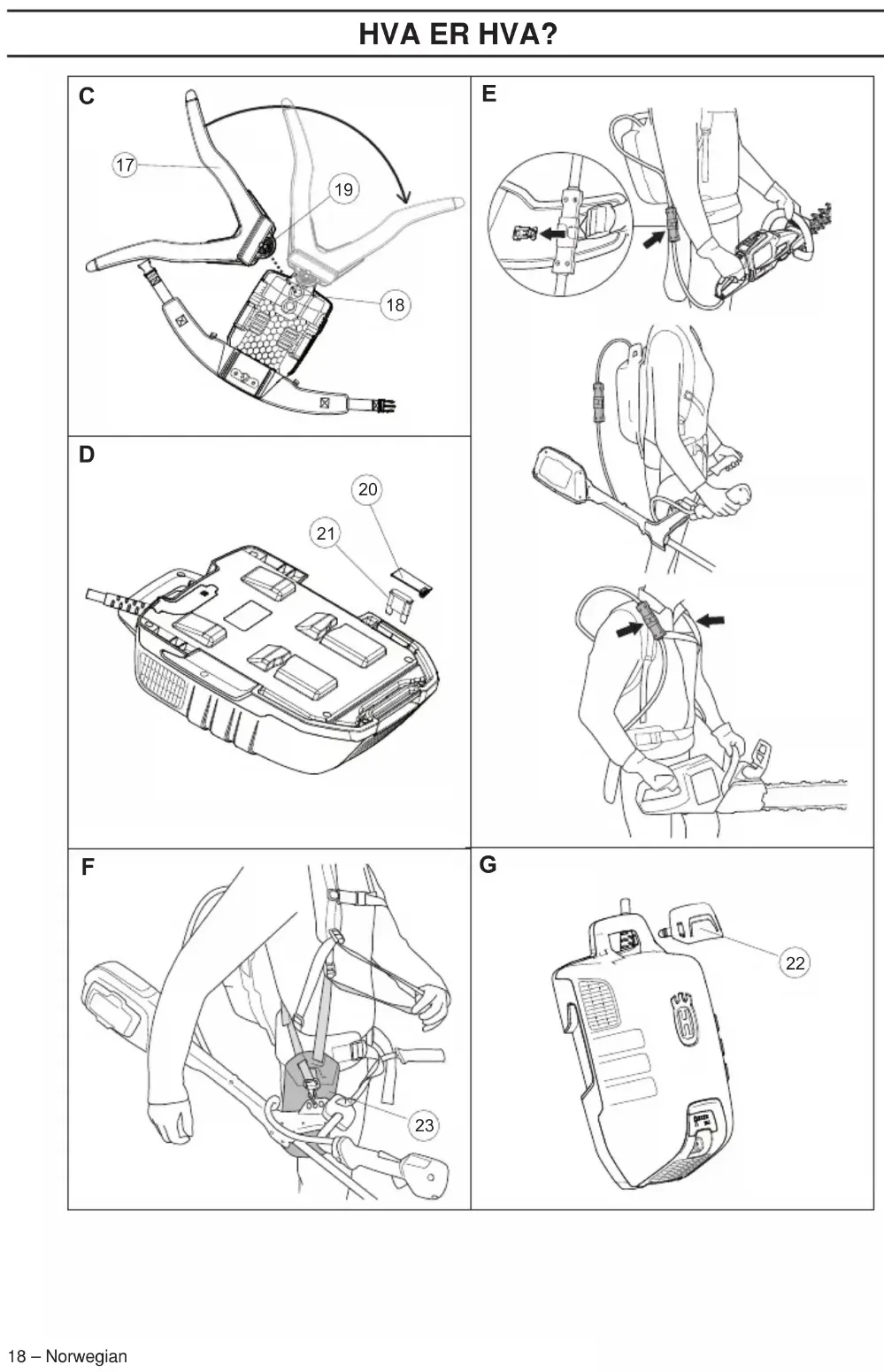 19BATTERIHÅNDTERING Norwegian – 19 Symbolforklaring Oversettelse av original svensk bruksanvisning. ADVARSEL! Et batteri som brukes feil eller uaktsomt kan være et farlig redskap, som kan forårsake alvorlige, til og med livstruende skader. Det er svært viktig at du leser og forstår innholdet i brukerhåndboken. Les nøye gjennom bruksanvisningen og forstå innholdet før du bruker maskinen. Les nøye gjennom brukerhåndboken for det relevante trådløse apparatet fra Husqvarna, og forsikre deg om at du har forstått instruksjonene før du bruker maskinen. Dette produktet er i overensstemmelse med gjeldende CE-direktiv. Symbolet på produktet eller dets emballasje indikerer at dette produktet ikke kan håndteres som husholdningsavfall. Det skal i stedet leveres til egnet gjenvinningsstasjon for gjenvinning av elektrisk og elektronisk utstyr. Dette produktet må innleveres til et gjenvinningsanlegg. Batteriet må ikke lagres utendørs i regn eller våte forhold. Du finner følgende etiketter på ryggsekkbatteriet: Batterisikkerhet Denne delen beskriver sikkerhet i forbindelse med batteriet og batteriladeren til det batteridrevne produktet. (1) til (23) henviser til bildene A–G på side 2 og 3. Det må bare brukes originale Husqvarna-batterier i Husqvarna-produkter, og batteriene må bare lades i en original batterilader fra Husqvarna. Batteriene er programvarekryptert. Batteri De oppladbare Husqvarna-batteriene, BLi, brukes kun som strømforsyning til relevante Husqvarna ledningsfrie apparater. For å unngå skade må batteriet ikke brukes som strømkilde til andre apparater. Det følgende viser en typisk, men ikke uttømmende liste med gode råd som produsenten av utstyret leverer til sluttbrukeren.
