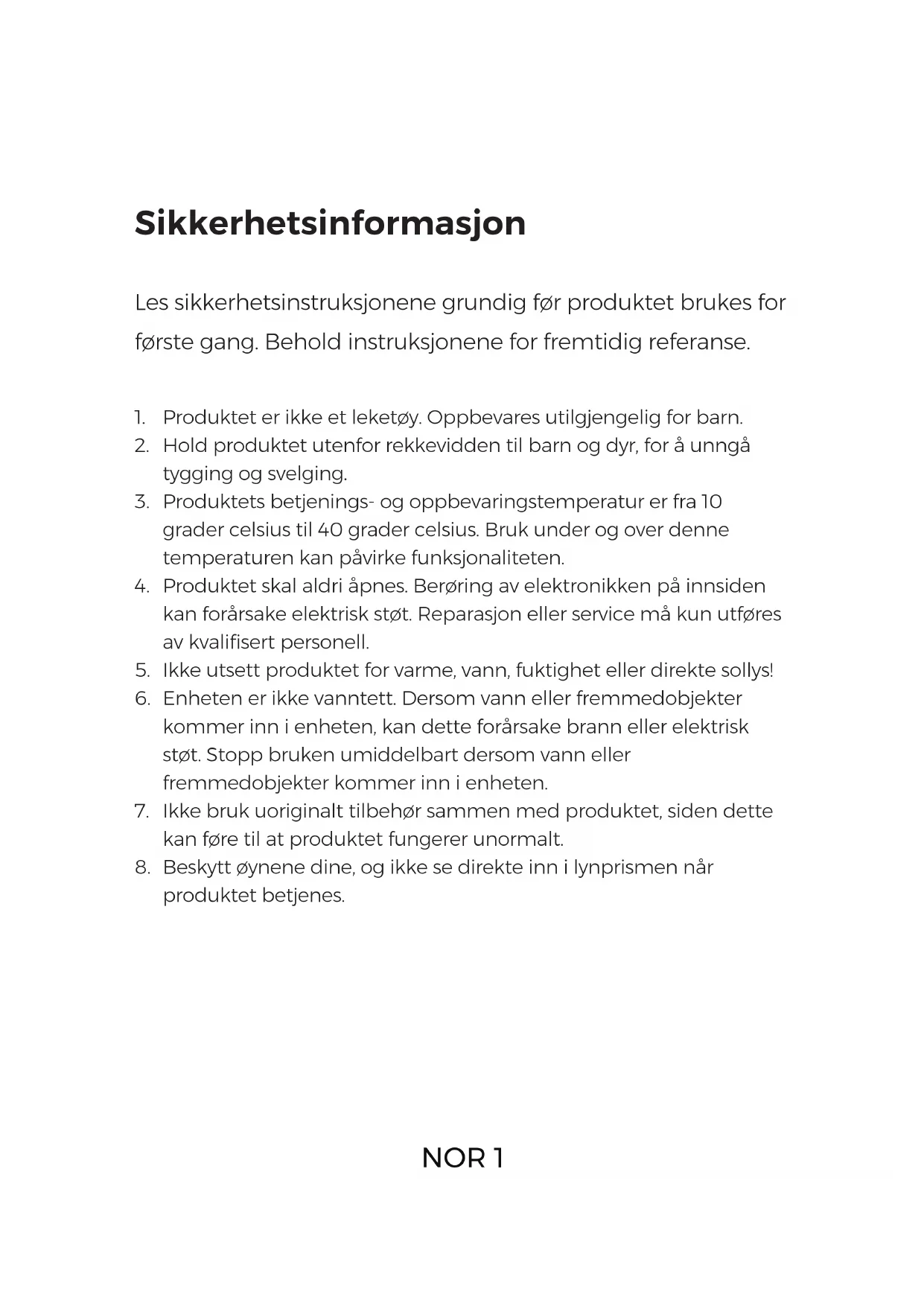 NOR 1 Produktet er ikke et leketøy. Oppbevares utilgjengelig for barn. Hold produktet utenfor rekkevidden til barn og dyr, for å unngå tygging og svelging. Produktets betjenings- og oppbevaringstemperatur er fra 10 grader celsius til 40 grader celsius. Bruk under og over denne temperaturen kan påvirke funksjonaliteten. Produktet skal aldri åpnes. Berøring av elektronikken på innsiden kan forårsake elektrisk støt. Reparasjon eller service må kun utføres av kvalifisert personell. Ikke utsett produktet for varme, vann, fuktighet eller direkte sollys! Enheten er ikke vanntett. Dersom vann eller fremmedobjekter kommer inn i enheten, kan dette forårsake brann eller elektrisk støt. Stopp bruken umiddelbart dersom vann eller fremmedobjekter kommer inn i enheten. Ikke bruk uoriginalt tilbehør sammen med produktet, siden dette kan føre til at produktet fungerer unormalt. Beskytt øynene dine, og ikke se direkte inn i lynprismen når produktet betjenes. Les sikkerhetsinstruksjonene grundig før produktet brukes for første gang. Behold instruksjonene for fremtidig referanse.Discolys med fjernkontroll